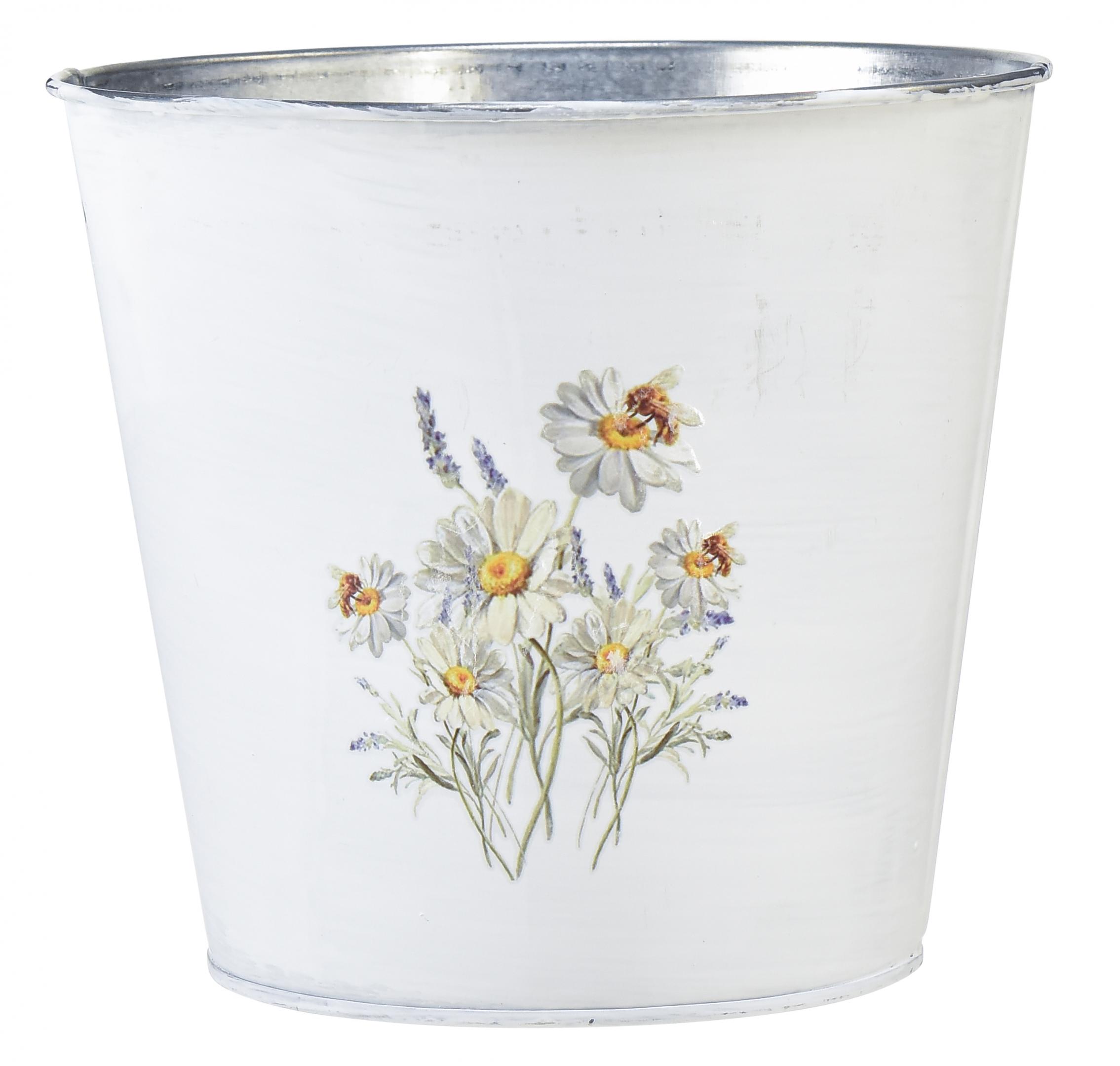 The metal planter is a beautiful table decoration for spring and summer. What makes the flower pot in white special is the flower motif with daisies and lavender.