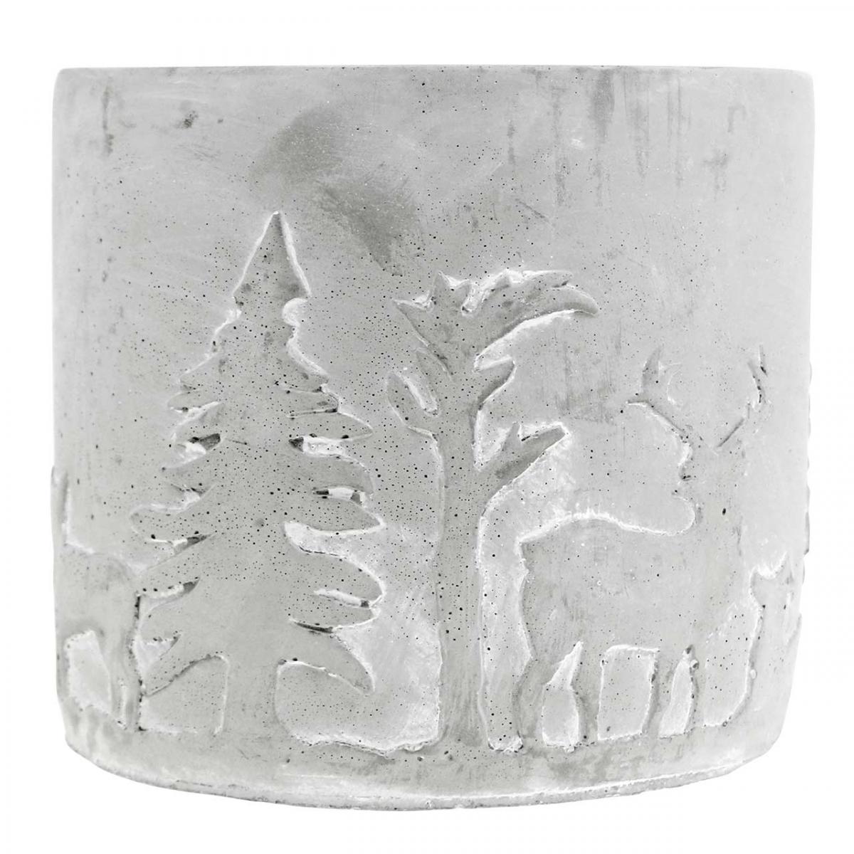 A planter with a forest motif is a particularly beautiful winter decoration. The concrete planter can be planted very well with Christmas plants such as a poinsettia or Christmas cactus in Advent. The ceramic pot for Christmas can also be used as a vessel for a winter arrangement or, with a set glass, as a vase for a Christmas bouquet for table decorations.The planter is decorated all around with a flat relief-like forest decoration made of fir trees, two deer, a stag and a fox. The plant pot is concrete gray, the forest animals are washed white on the edges, which makes them stand out nicely from the concrete pot.