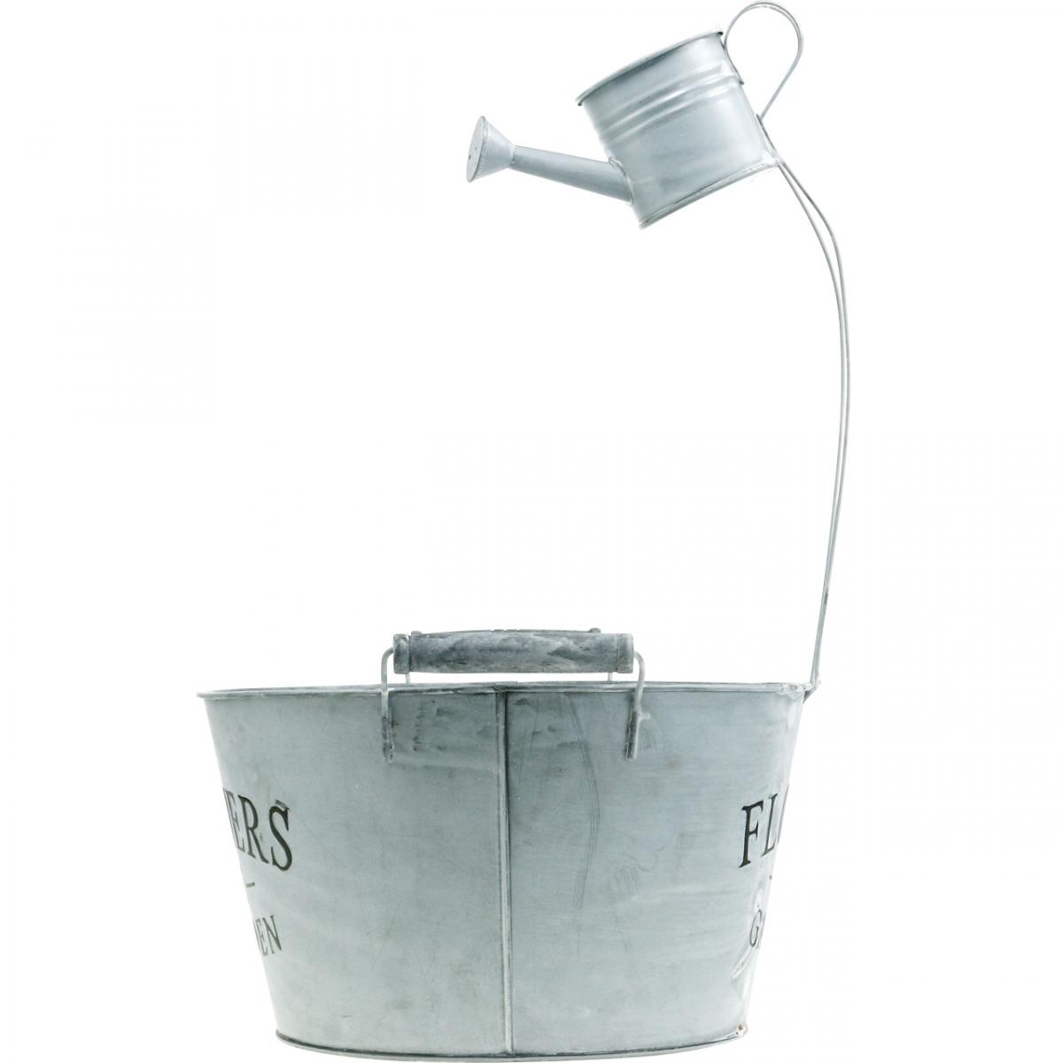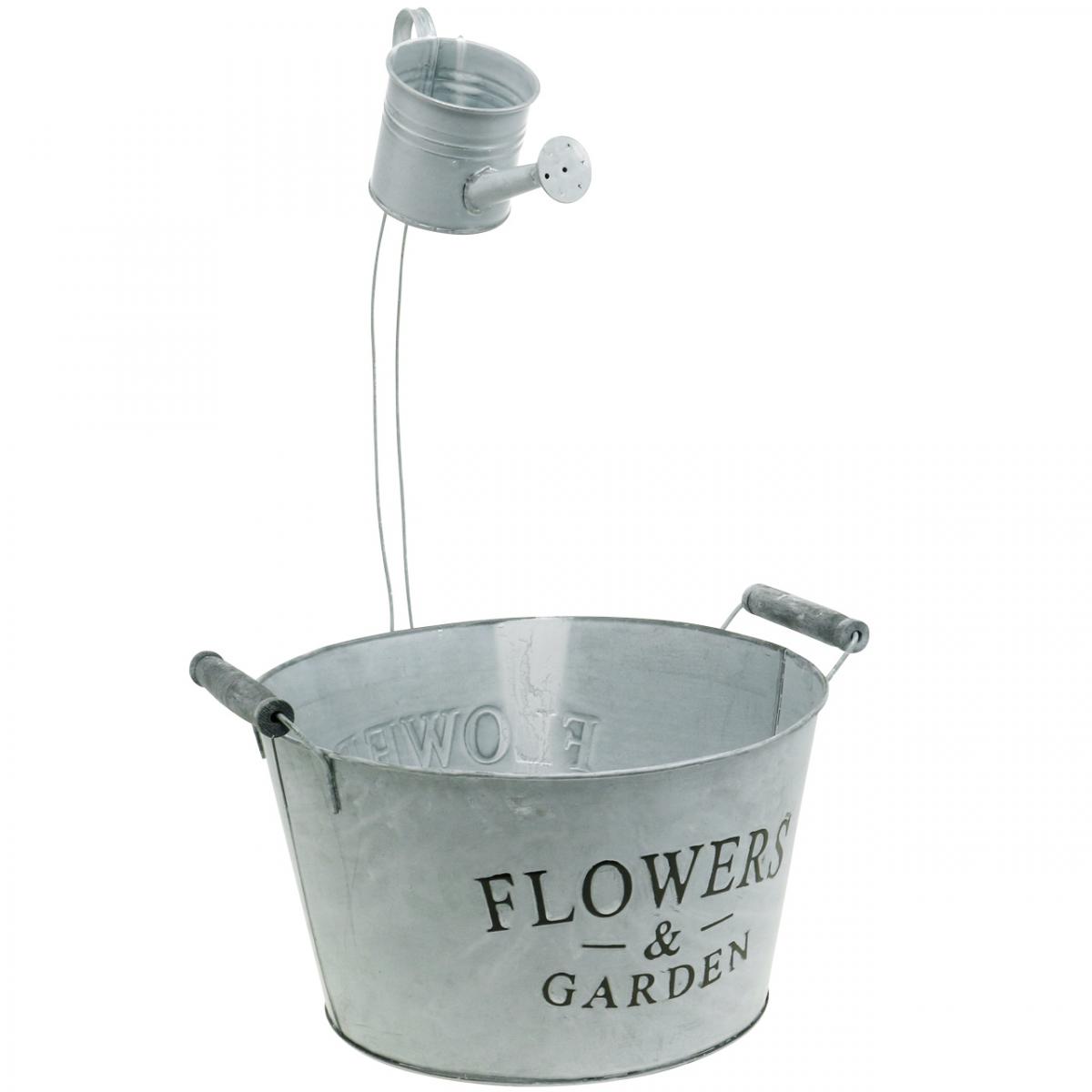 Planting bowl with watering can, garden decoration, metal planter for planting silver white washed H41cm Ø28cm/Ø7cm