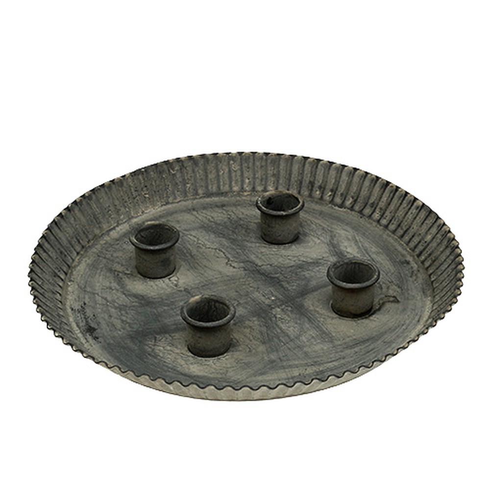 The plate is made of weatherproof, gray-washed metal and has an upwardly fluted edge. The total diameter is about 25 centimeters and the four candle holders each have a diameter of about 2.5 centimeters and are about 1.8 centimeters high.