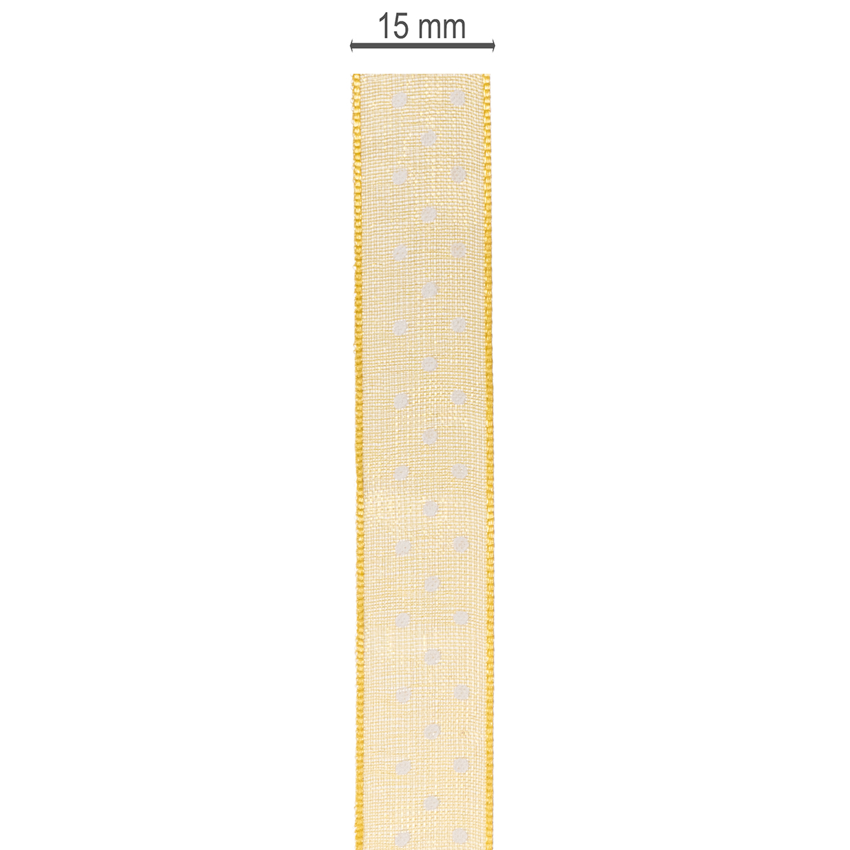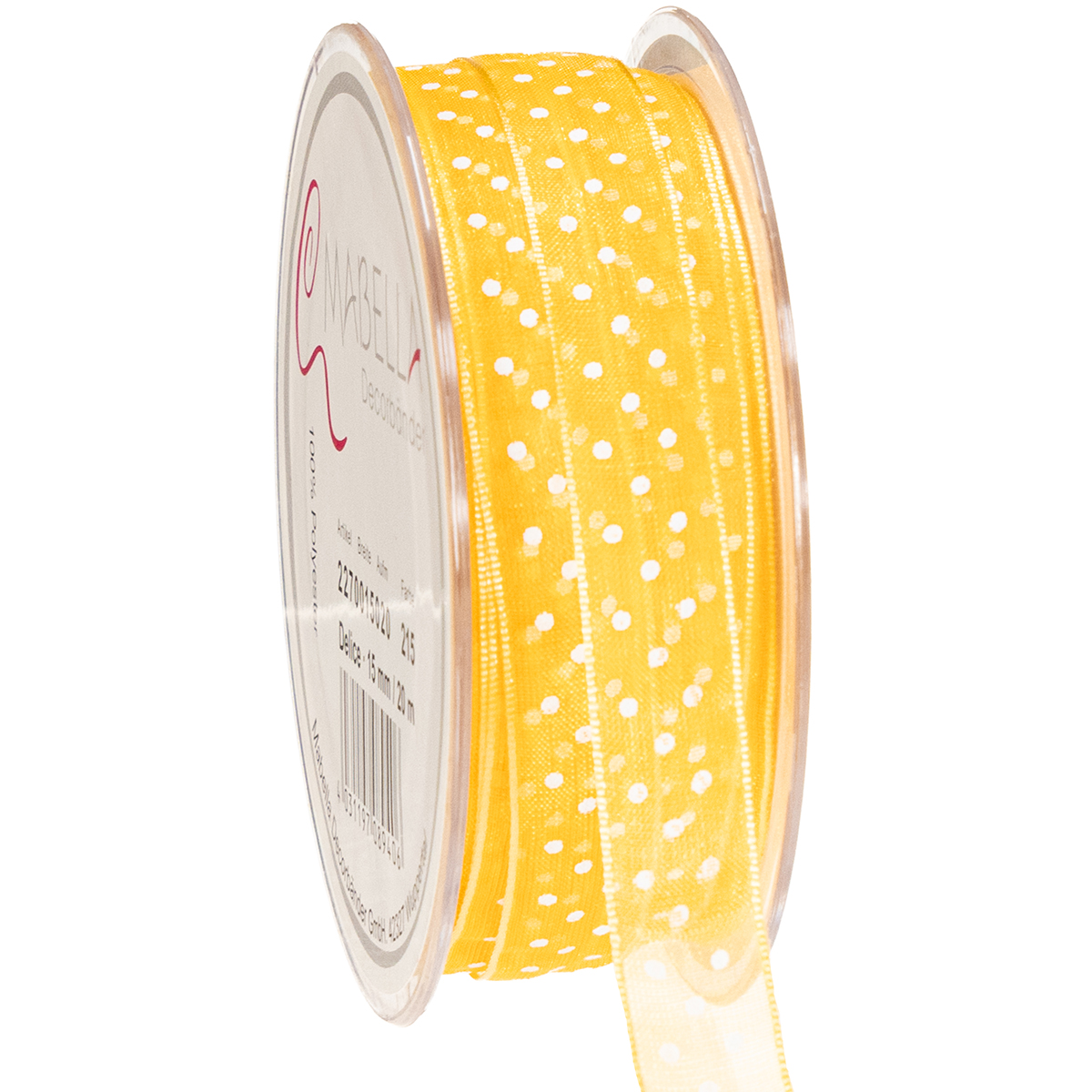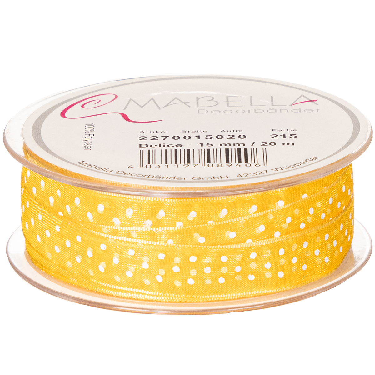 The yellow ribbon with the white dots is made of 100% polyester and measures around 25 millimeters in width and around 20 meters in length. You get it on a small, handy spool made of plastic, which you can stow very practically in a drawer or in the sewing basket.