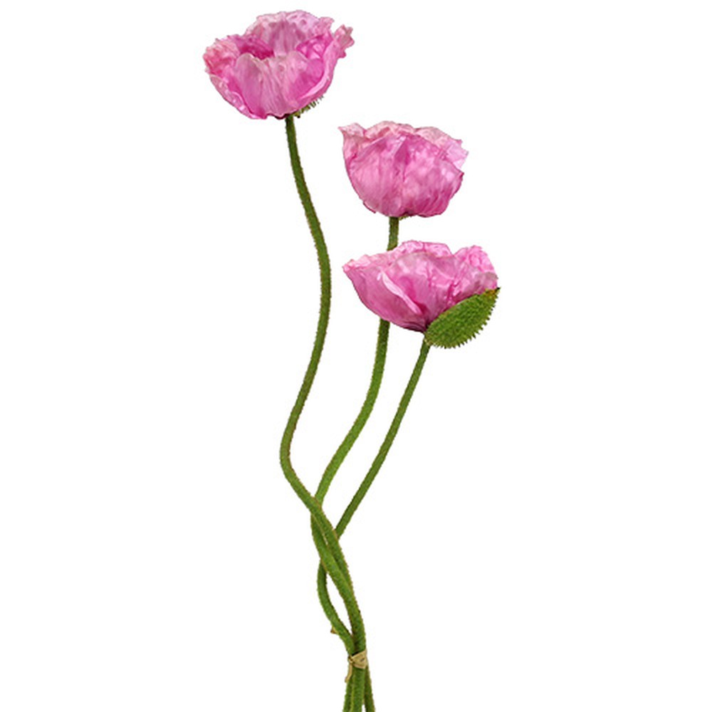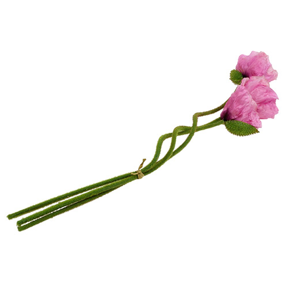 With these 3 large poppies, which are tied together with a natural-colored bast ribbon, shimmering, pink-violet petals were combined with juicy, yellow-green, brownish flocked stems: Spring couldn't be more beautiful in your decoration projects! The dreamy artificial plants are also equipped with spiky, green-brown flower capsule remains and pollen stalls in black and red and thus impress with the naturalness with which they are modeled on the botanically called Papaver.Make use of the metal core inside the 3 stems and bend them decoratively so that the plastic poppy flowers can be beautifully arranged in a high floor vase or lying in a shop window. Each design variant allows you to combine the decorative flowers with other artificial plant varieties or with different colored poppies. Depending on the selection, a spring-like, summery or - for example together with golden ears of wheat - an autumnal overall picture emerges.