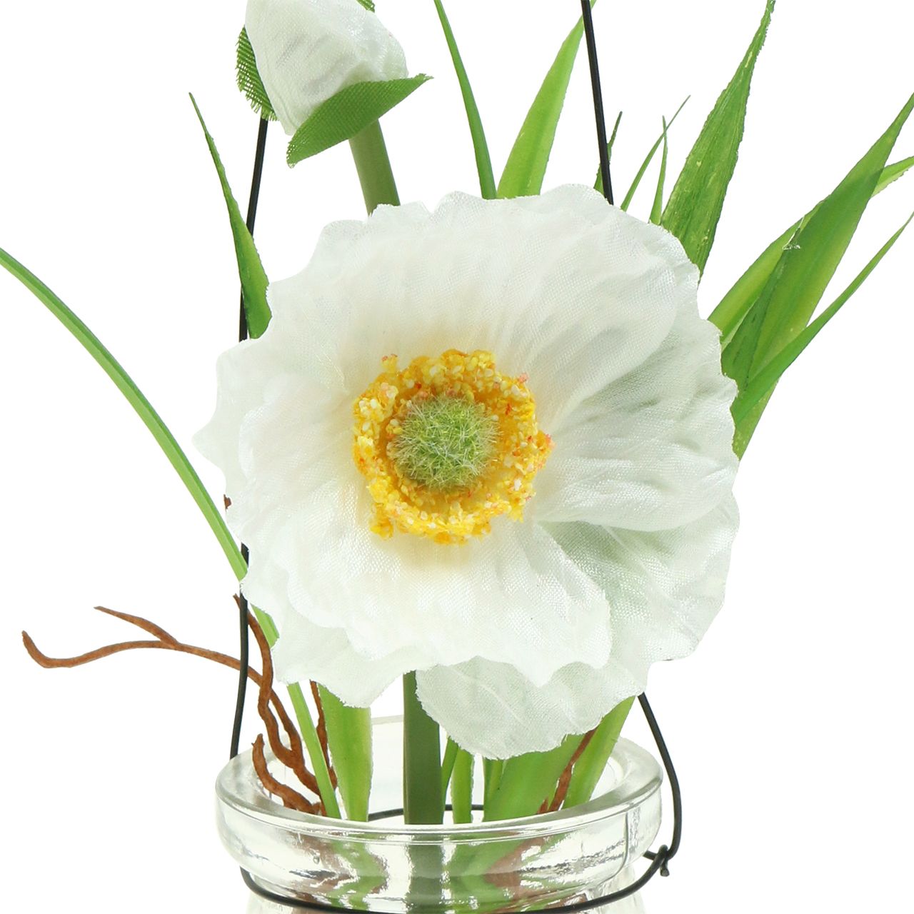 The white poppy in orange to hang in a glass has a total height of around 22 centimeters with a metal handle, while the artificial flower itself has a height of around 13 centimeters. The diameter of the decorative glass is around 5 centimeters.