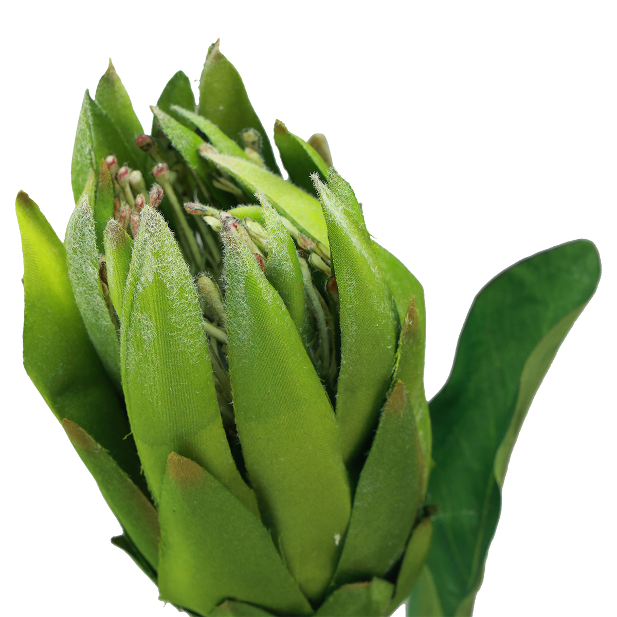 This artificial plant is modeled on a young protea. The artificial branch is green, the flowers are still slightly closed. However, if you look closely you can see the wine-red stamens and the calyx also turns slightly brown.