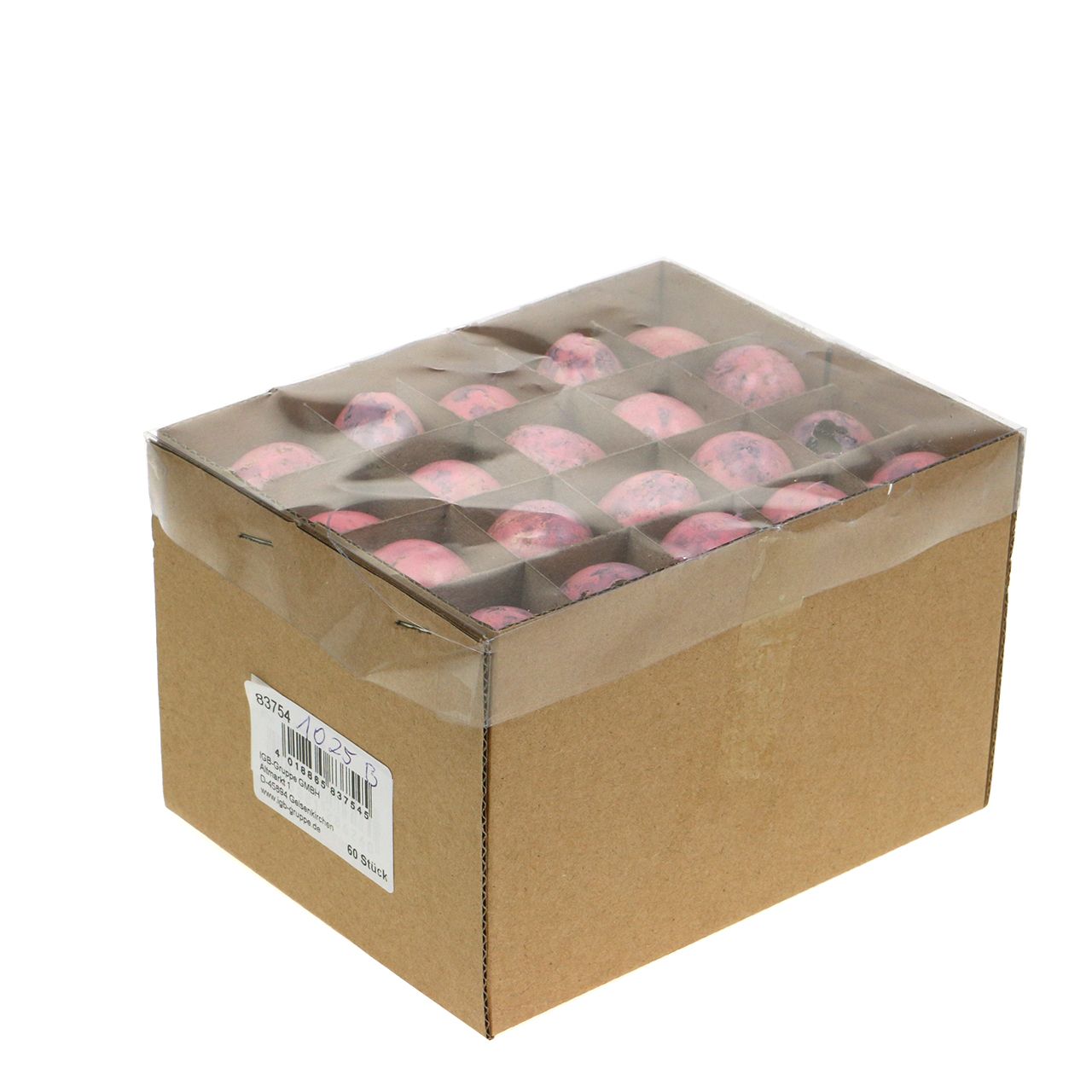 The quail eggs in light pink are available in a set of 50 in total, which is delivered securely in a box with a transparent lid. The size of the eggs is about 3 centimeters.