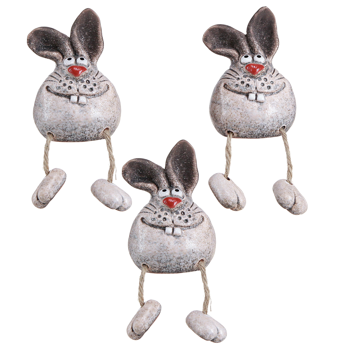 Our ceramic rabbits as decorative figures not only bring a smile to every face, but also a touch of wit and elegance to your home. With their cheeky charisma and charming smile, these edge sitters are the ideal addition to any Easter decoration. Made from high-quality ceramic, the rabbits impress with their detailed design and lovingly designed faces. Their sitting shape means they fit perfectly on window sills, bathroom shelves or living room shelves. With dangling jute legs and robust ceramic paws, they perfect the spring decoration in a playful way. Our funny ceramic rabbits are not only an eye-catcher, but also a stylish way to spread Easter spirit in your home. These timeless, country-style figures offer a decorative all-purpose solution and are an excellent gift idea for friends and family.