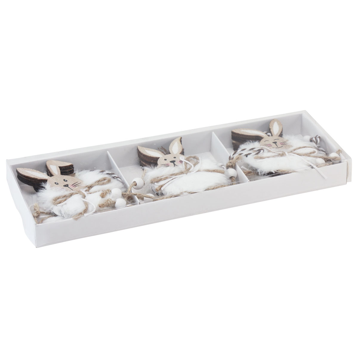 The wooden decorations for Easter are available in packs of 6, with 3 bunnies each showing a different face.