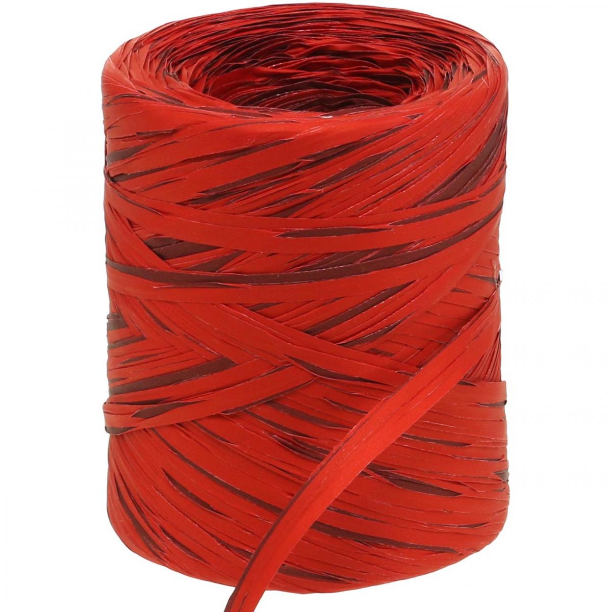 The raffia ribbon colored in red and burgundy, which is made of plastic, is about 200 meters long. It measures about 10 to 15 millimeters in width, although this number can vary. Because the band is made of flexible fibers, it expands as the fibers are pulled apart.