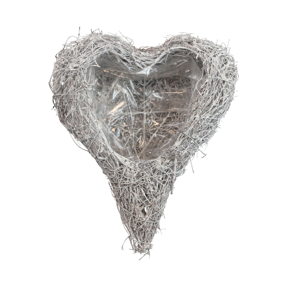 The whitewashed vine heart measures around 30 x 25 x 7 centimeters. The inner dimensions of the planting area are approximately 13 x 13 x 5 centimeters.