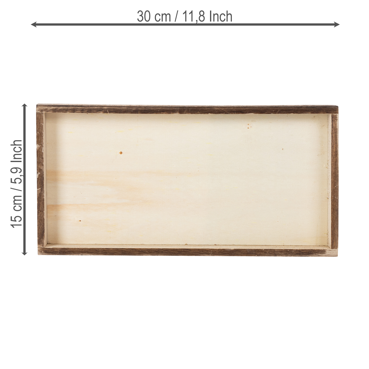 This rectangular wooden tray will quickly become your new favorite household companion – whether for practical purposes or as a decorative piece in your home. Measuring 30 cm long, 15 cm wide, and 3 cm high, it offers ample space for everyday items like keys, pens, or spice jars. At the same time, it's also the perfect showcase for your decorations: whether you arrange scented candles, sand and seashells, or a small floral arrangement on it – this tray highlights your creative ideas and creates a tidy, elegant look.