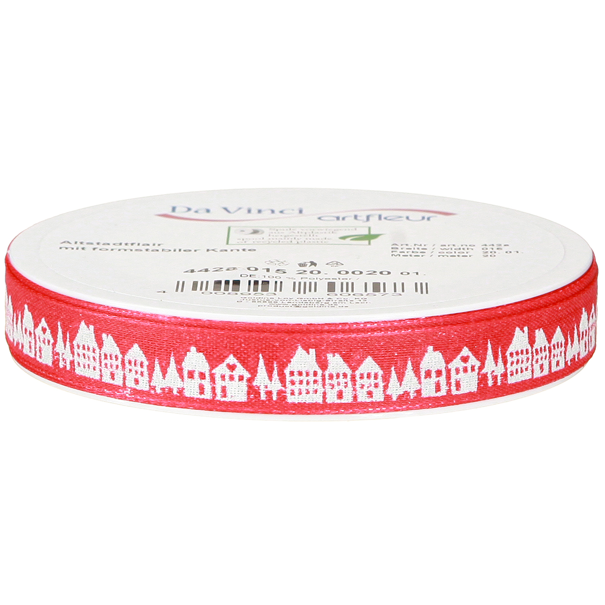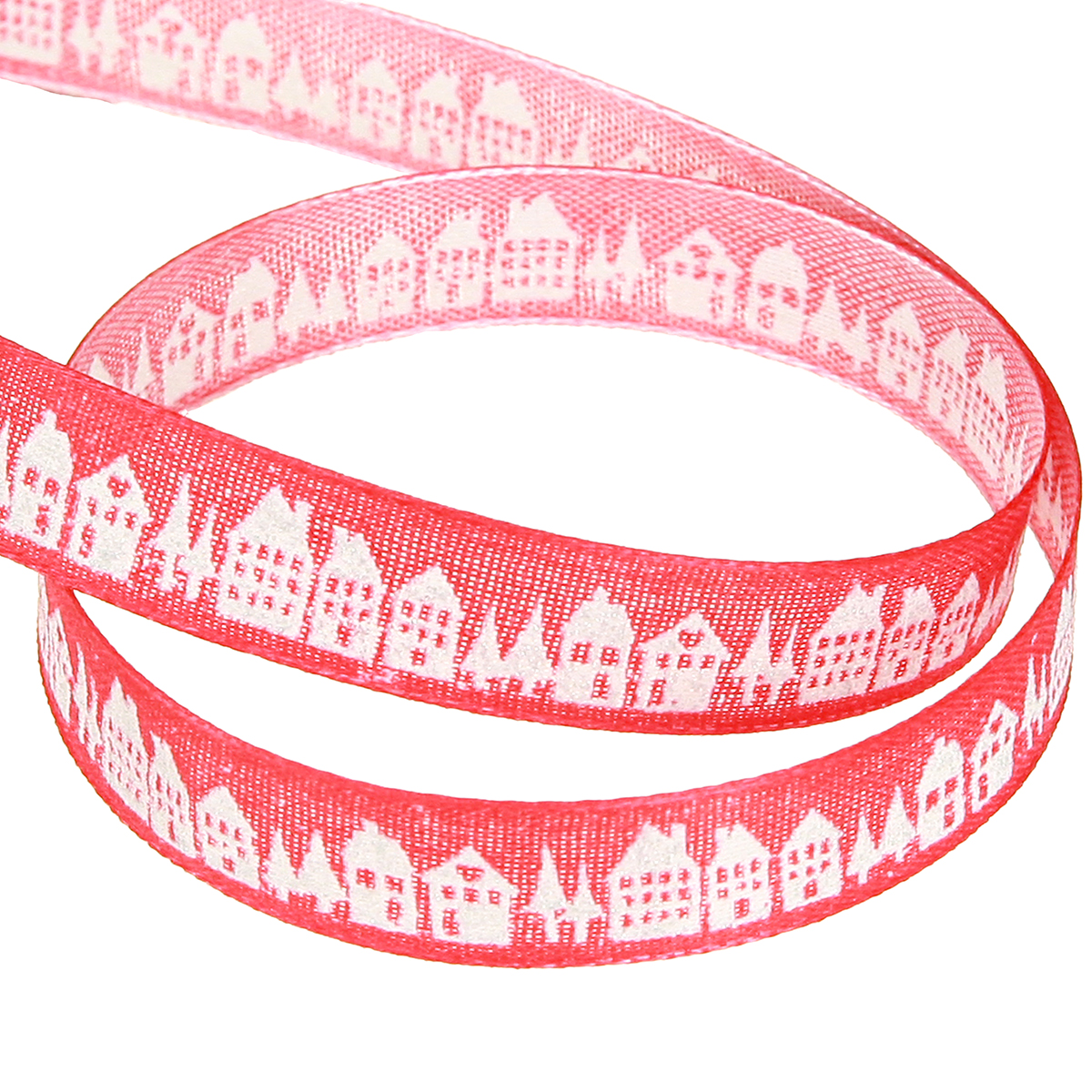 Product name: Red Christmas ribbon with white houses 15mm 20m