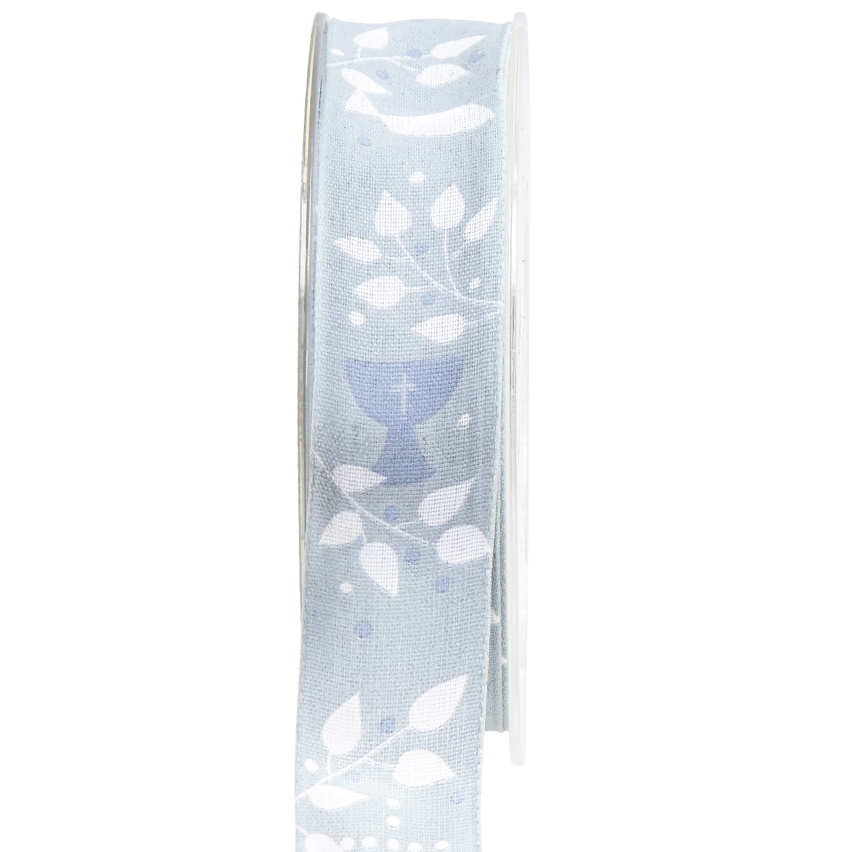 The light blue fabric band is printed with Christian symbols in white and dark blue, which refer to the religious occasion and have a wonderfully timeless design. Since the motifs are surrounded by tendrils of leaves, the ribbon can be easily incorporated into flower decorations for communion. A selvedge gives the decorative ribbon stability.