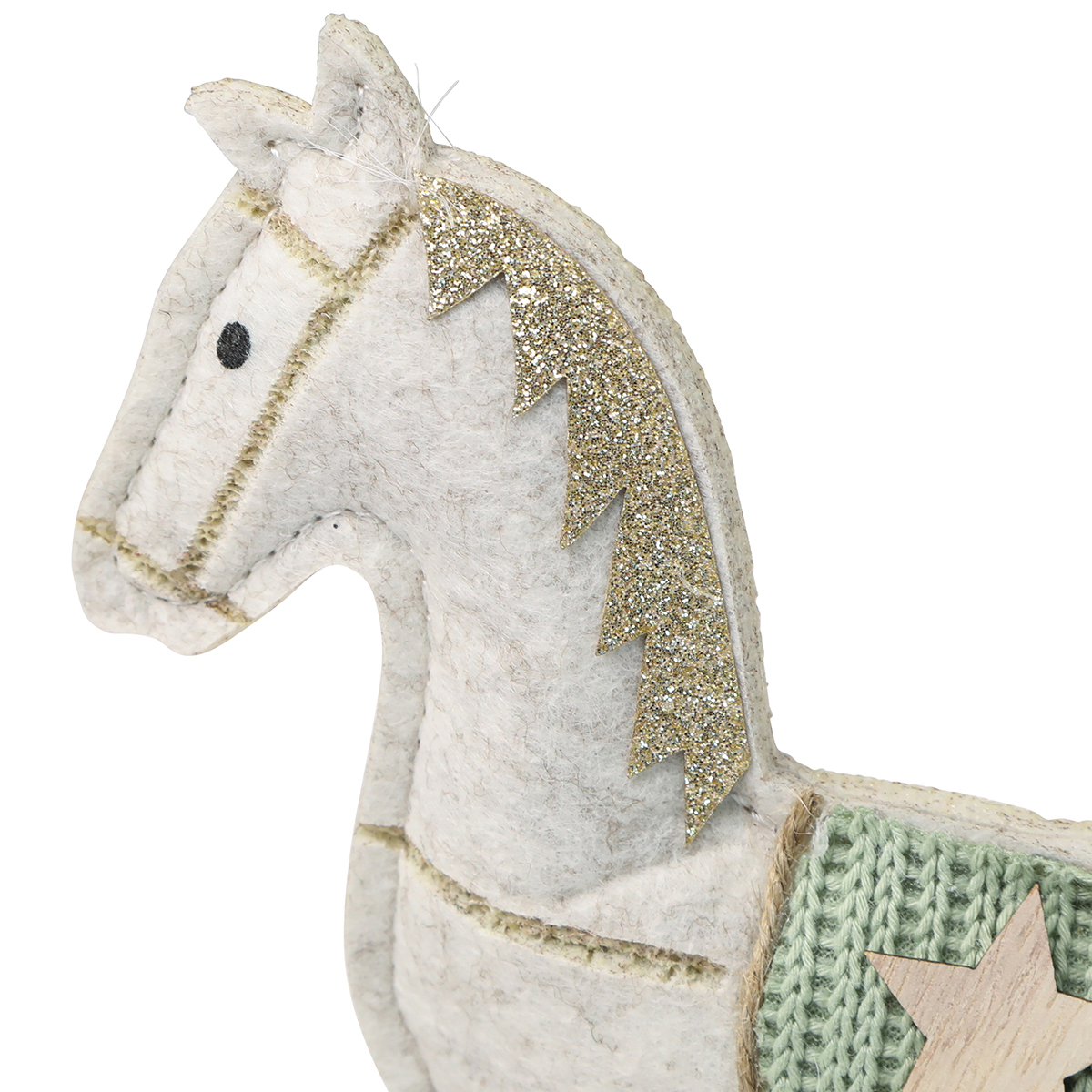 This decorative rocking horse in cream-colored felt with a golden halter and green saddle with a star adds a nostalgic touch to your Christmas decorations. The felt decoration is decorated on one side and stands securely on its wooden runners. The runners have a flattened area for safe positioning. The golden mane gives the rocking horse a festive shine, while the tail with fluffy white fibers, the green saddle with a star and the black eyes are lovely details.