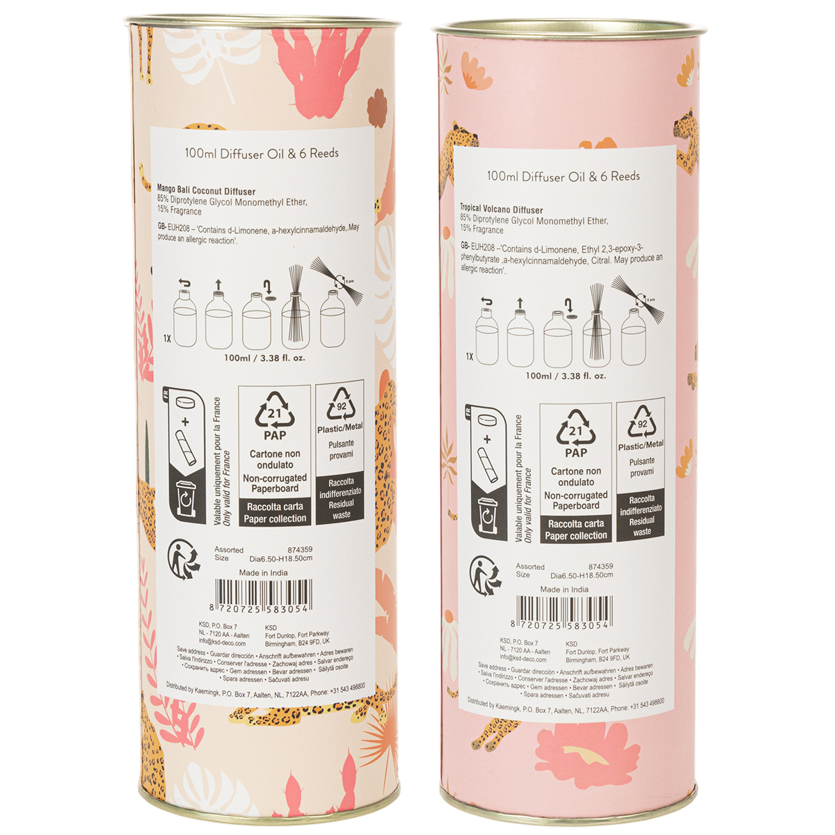 These room fragrance diffusers release two irresistible scents: mango and coconut. The combination of fruity sweetness and creamy tropical notes creates a relaxing and inviting atmosphere in your living space. The set of two diffusers allows you to scent your home in a variety of ways, perfectly tailored to your rooms or moods. Whether placed on a side table in the living room, used as a decorative element in the bathroom, or as a welcoming fragrance in the entryway, the diffuser blends harmoniously into any environment. The glass bottles, measuring six centimeters in diameter and 19 centimeters in height, are not only practical but also visually appealing with their multicolored design.