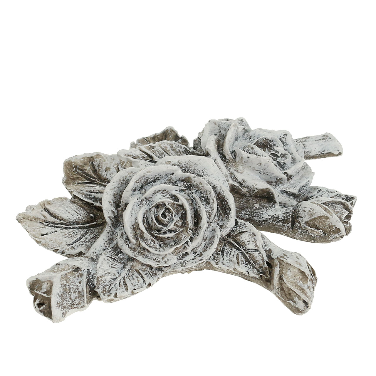 The polyresin rose, suitable for a grave decoration, measures around 10 x 8 centimeters and is around 2 centimeters high when lying down. You will receive the set of 6 in a cardboard box with a transparent plastic lid.