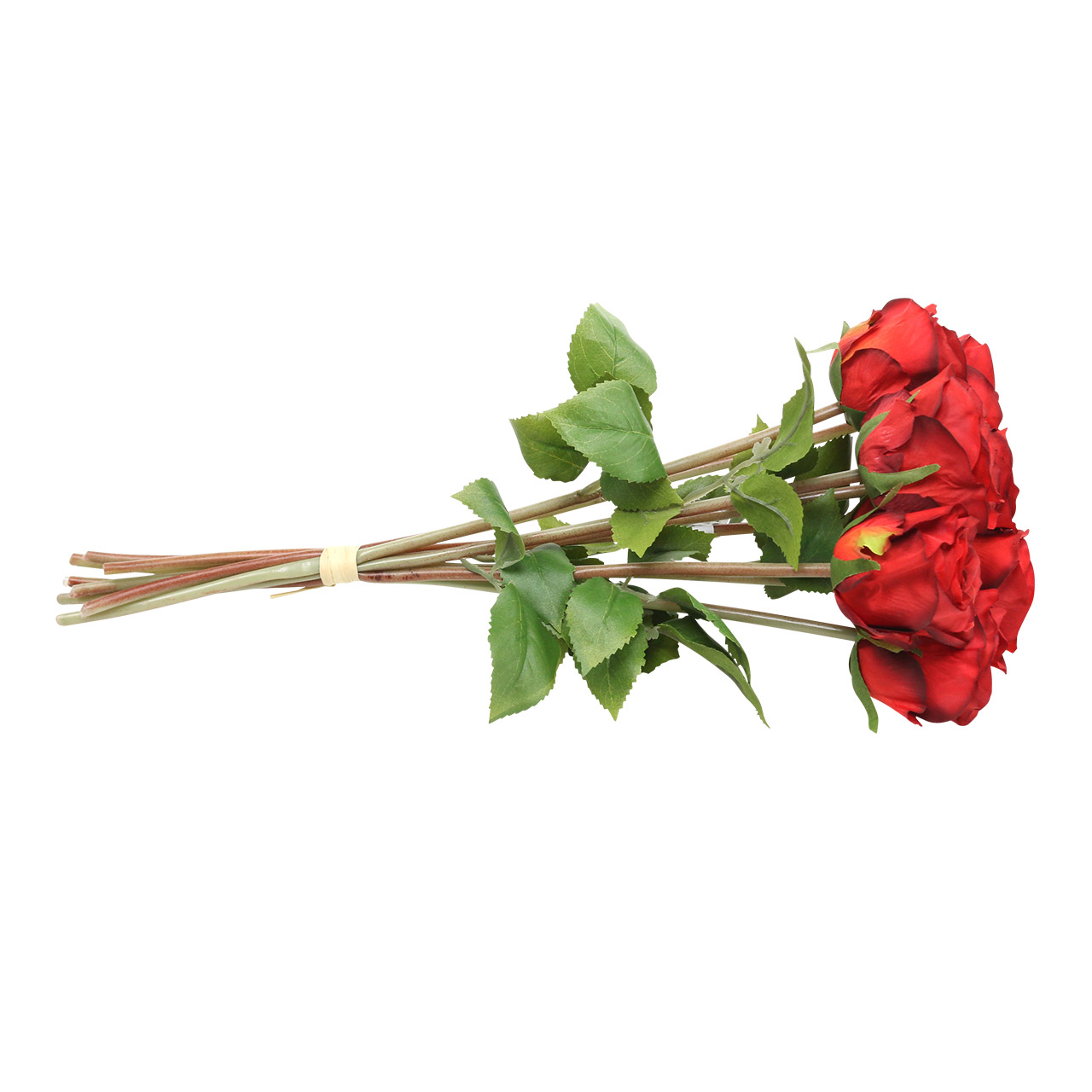 The artificial red rose reaches an approximate length of 36 centimeters with the stem, with each flower reaching a diameter of about 5.5 centimeters. The bunch of eight is held together by a ribbon made of artificial bast, which you can easily tear open so that the roses can be used individually.
