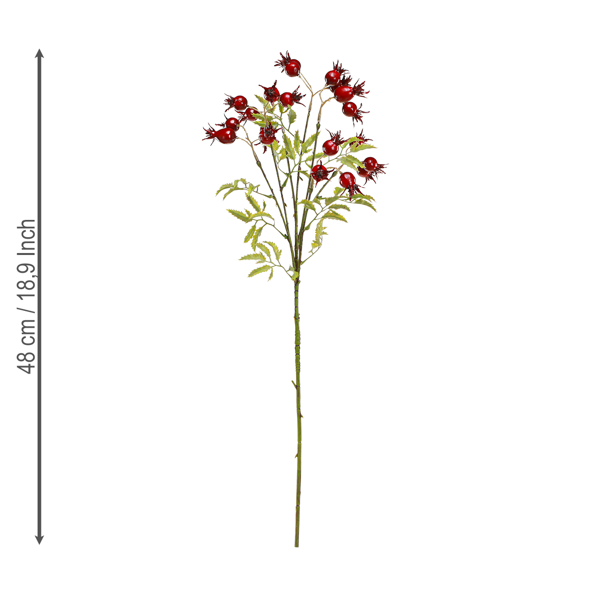 Do you love the autumnal mood but don't want to constantly buy fresh decorations? Who doesn't? These dark red, artificial rosehip branches bring autumn directly into your home – without any effort or stress. Imagine how these atmospheric branches will enhance your table setting. Or maybe they'll liven up your sideboard? No matter where you place them, these branches are a real eye-catcher! At 48 cm long, they fit perfectly in any vase and their seven plump fruits exude warm elegance. Make yourself comfortable, let nature do the talking, and enjoy a bit of autumn magic without having to constantly change your decorations.