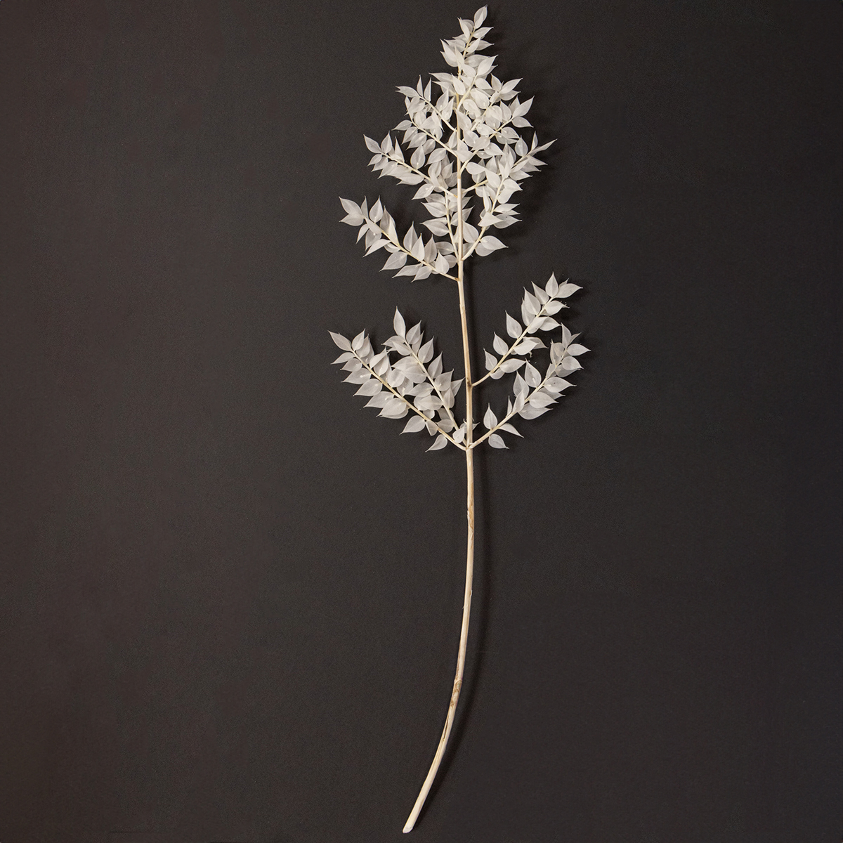 Ruscus, or butcher's broom, is cut into branches of approximately equal length and carefully dried and bleached or dyed. The bleached Ruscus branches have a slightly translucent shimmer in places when used in decorations.