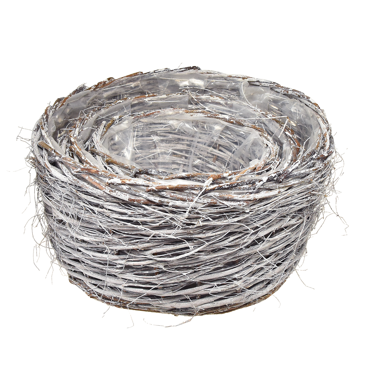 Our rustic wicker baskets embody rural warmth with their natural grey tones and gently white washed finish. The sizes 40cm, 33cm and 26cm are lined with foil and offer a variety of uses - be it stylish planters or an aesthetic storage solution. Thanks to the robust handles, transport is easy. Ideally, our baskets also prove themselves in the more subtle role as a complement to home accessories in a maritime, Scandinavian or classic style by emphasizing the natural component.