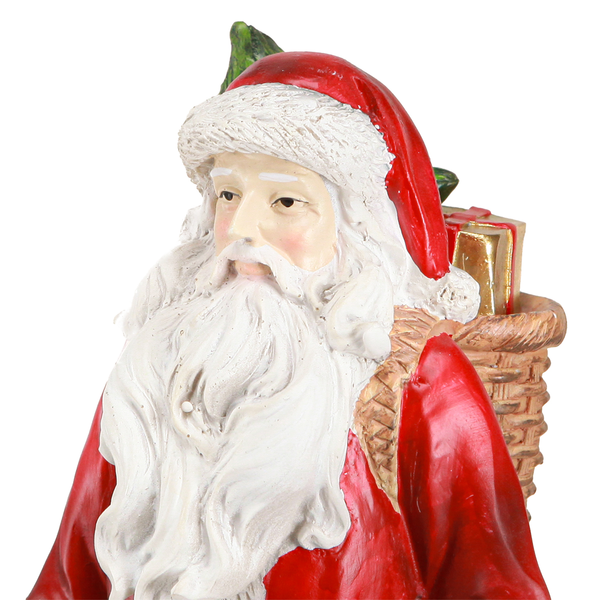 - Detailed workmanship: long white beard strands, festive basket with Christmas tree and gift