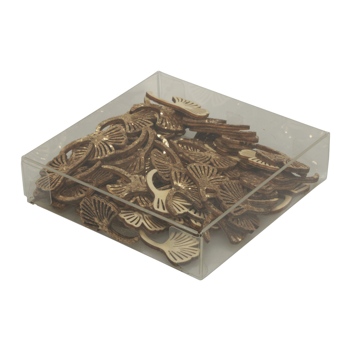 You will receive 72 gingko leaves. The gingko decoration is covered with golden glitter on one side, so that the natural-colored wooden side can be easily moistened with hot-air glue and attached to objects.