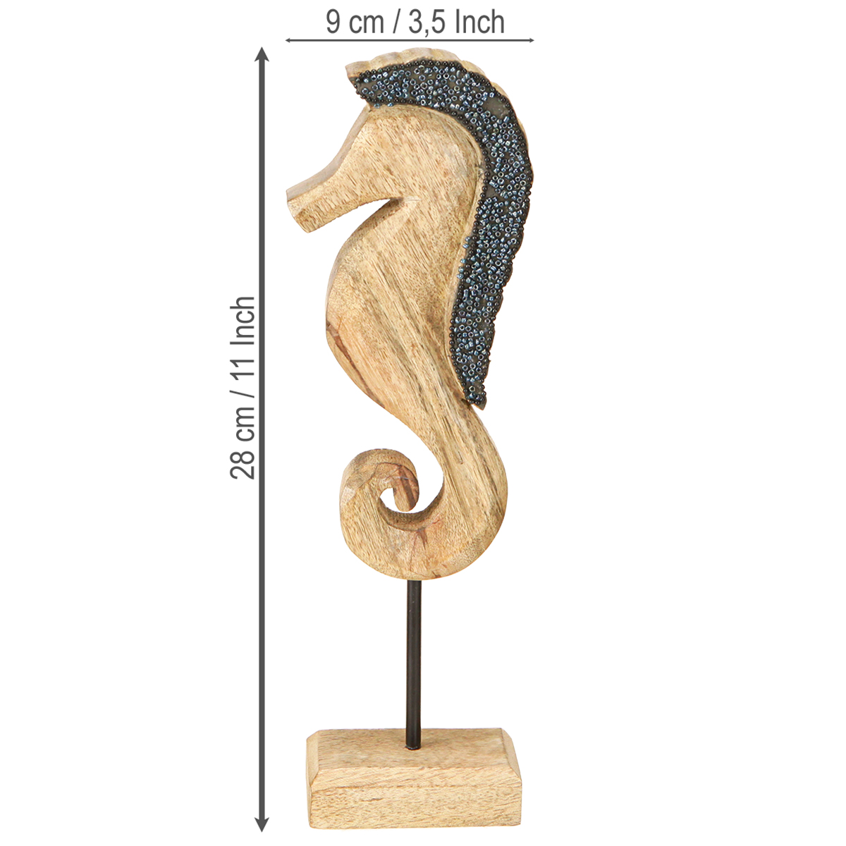 Add a touch of the sea and elegance to your living space with our handcrafted seahorse decorative figurines made of mango wood. This seahorse table decoration measures approximately 28 cm and is made of fine mango wood, decorated with carefully set pearls. The blend of natural wood tones and radiant pearls lends any setting a unique maritime flair. Whether in the living room as a summer accent, in the bathroom as a reminder of your last beach vacation, or as a unique eye-catcher in your vacation home – this nautical decorative seahorse brings the feeling of sun and beach directly into your home. Its modern yet classic design blends seamlessly with various interior styles, from maritime to boho-chic. The mango wood impresses with its special grain and sustainability, making it the ideal choice for environmentally conscious decorators.