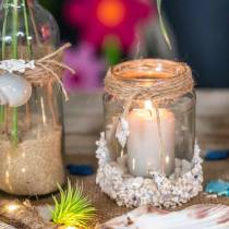 A glass bowl full of sand, a candle jar and a beautiful assorted mix of seashells are the perfect starting point for a marine centre piece. Add in some more marine decorations to recreate the beach of your dreams. If you go for fresh or artificial flowers instead, you can also create a trendy summer décor with a slight surreal touch.Impressive large seashells
