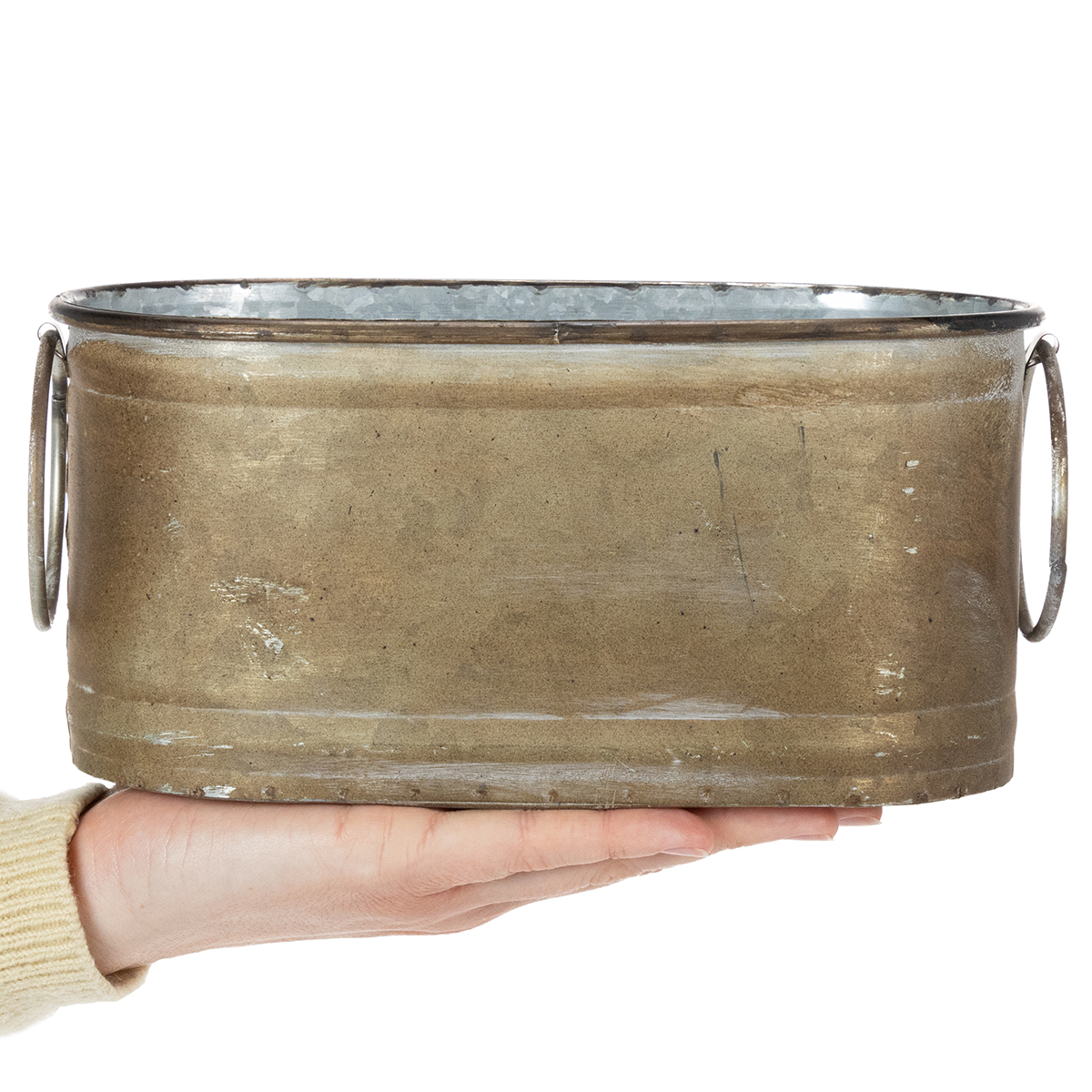 The cachepots in the set of 3 are shaped like small tubs. The outside of the metal tubs is washed copper-white. The color and shape are retro in style, making them suitable for a vintage table setting. The retro character is underlined by the large movable rings that act as handles.
