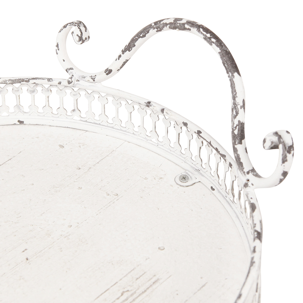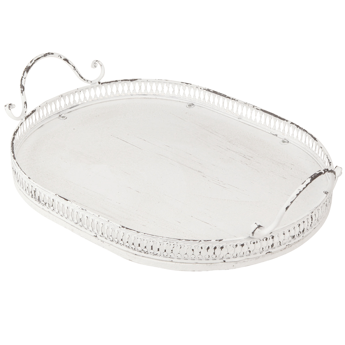 Each tray in white has a wooden base and a metal frame and handles with artificial scuff marks in a shabby chic look. As it is supplied as a set of 2, the tray is also suitable for creating larger arrangements.