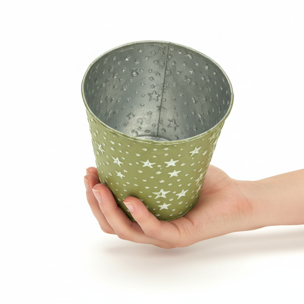Silver and green planter, metal flower pot with stars, Ø14cm