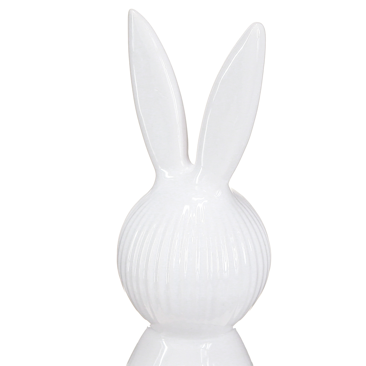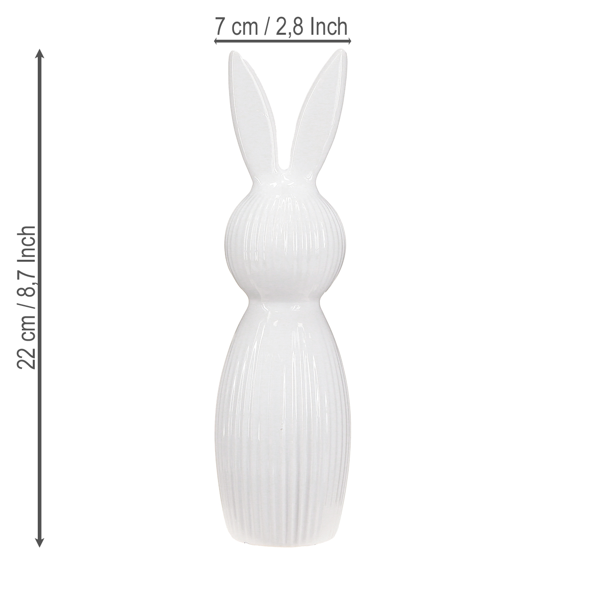 This simple rabbit figurine, crafted from high-quality ceramic, is distinguished by its unique combination of minimalist design and functionality. The high-gloss surface lends the figurines a special depth and reflective quality, instantly making them the focal point of your décor. They are perfect for spring and Easter decorations, whether on the Easter table, in a modern Easter bouquet, or as a subtle eye-catcher on your reception desk. Their height of 22 cm strikes the ideal balance between presence and understated elegance. The gently ribbed surface makes the rabbit figurine a delight to both the eye and the touch. Those who appreciate understated elegance will love the neutral white color. It harmonizes beautifully with almost any style: modern glass candlesticks, minimalist vases, or other light-colored spring accessories. Whether you choose to display these decorative rabbits individually or as a pair is entirely up to your creativity! A little tip: Complement the figures with other white ceramic decorative elements or combine them with pastel-colored highlights – this will create harmonious accents for a completely successful spring decoration.