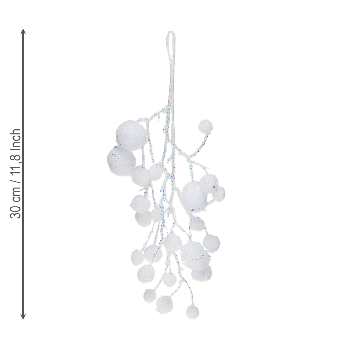 The white snowflake decoration with iridescent glitter is about 30 centimeters long. The diameter of the snowballs is about 1.5 - 3 centimeters.