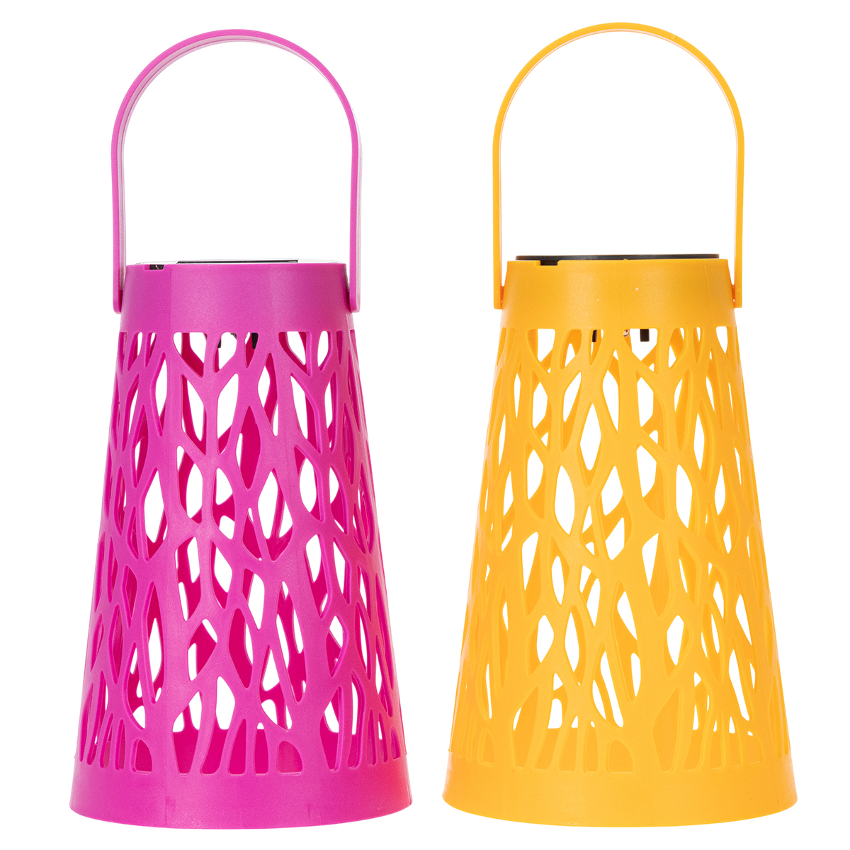 This set of two lanterns – one in cheerful pink and the other in vibrant yellow – will brighten up your outdoor spaces. The modern look of these LED lanterns, crafted from delicate, perforated plastic, perfectly complements a summery atmosphere and blends seamlessly with almost any garden style. The warm white light emitted by the LEDs creates a soft, inviting glow without glare, making these lanterns a versatile and beloved addition to your outdoor décor. Discover how easy it can be to make your garden shine!