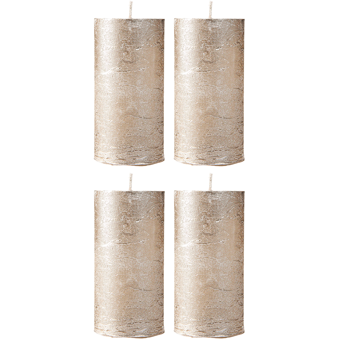 The pillar candles, which are colored in metallic platinum, have a height of about 100mm and a diameter of about 50mm and are supplied in a set of four in cardboard packaging. Their approximate burn time is approximately 25 hours. When burning, please observe the safety regulations for handling open fire.