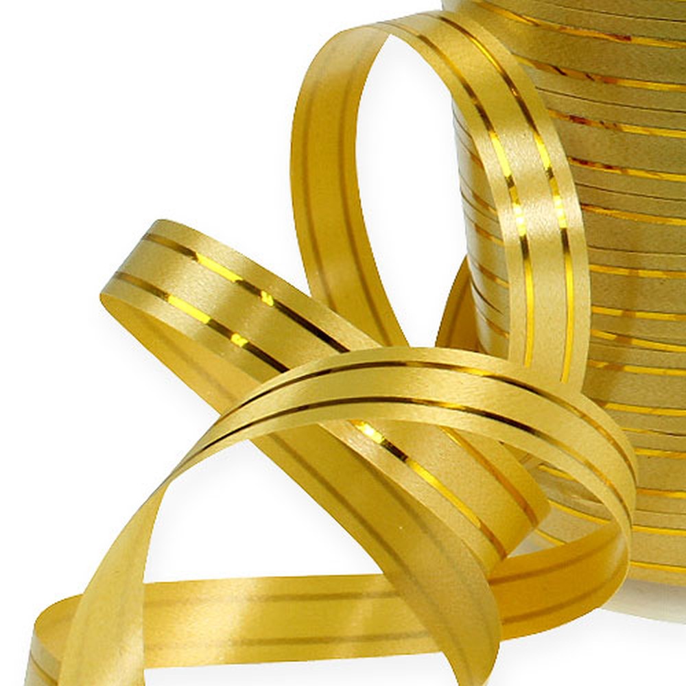 The split ribbon, in which 2 shiny gold strips adorn a matt gold background, measures around 10 millimeters in width and around 250 meters in length. It consists of 100% polypropylene and is wound on a plastic spool.