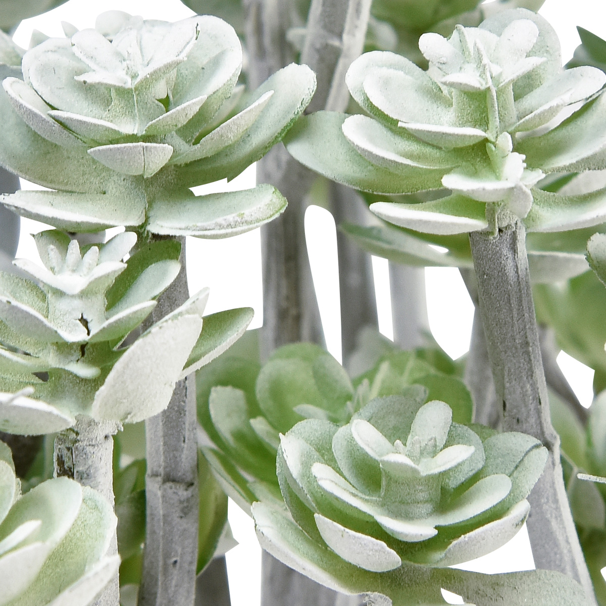 The artificial succulents have finely shaped leaves of different sizes and are colored white and green. Every artificial plant ends in a brown spike, also called a pick. This means you can easily stick the fat hen into any surface or wire it onto a wreath.