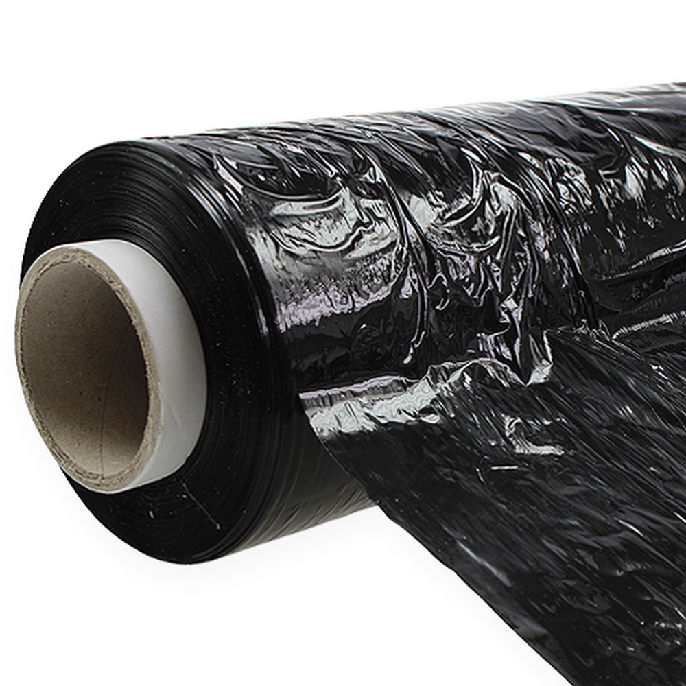 The stretch film or wrapping film in black is around 260 meters long and is wound on a cardboard tube. The foil has a width of about 50 centimeters and a thickness of about 20 microns.