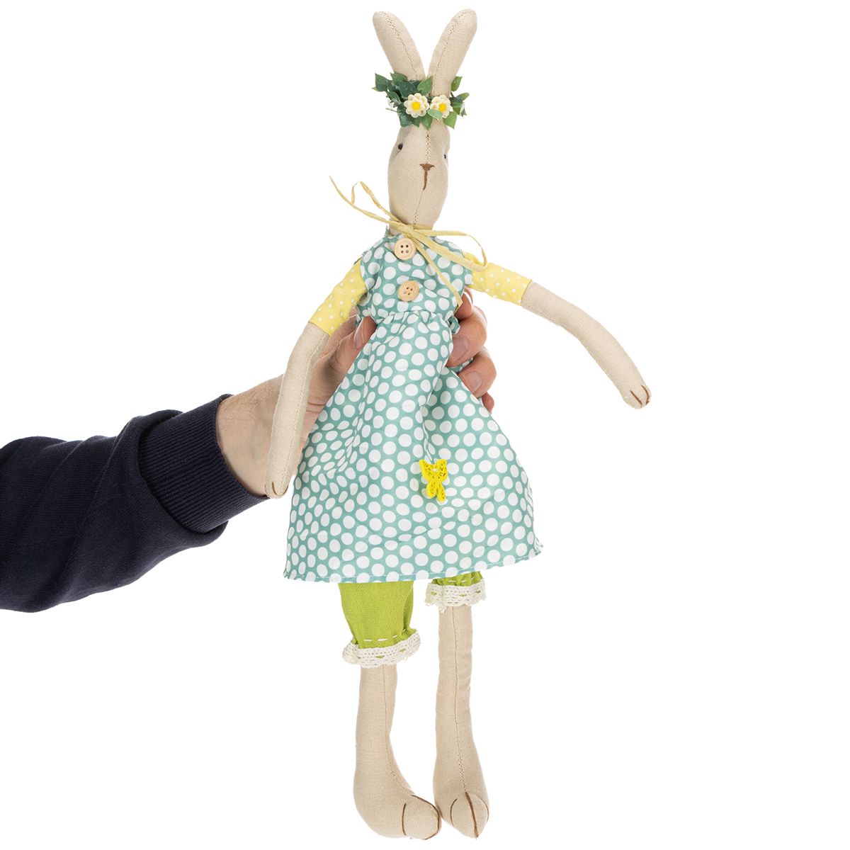The cute bunny girl is made of a simple natural fabric and wears a spring-like blue dress with large white dots. Underneath, sleeves in yellow and white and pretty green harem pants with lace edges complete the outfit of the bunny with dress. The beautiful rabbit also enchants with wonderful details such as wooden buttons and a butterfly decoration on the robe as well as a simple bow made of paper ribbon around the neck. The stuffed bunny wears a filigree wreath of flowers on its head, which completes its look.