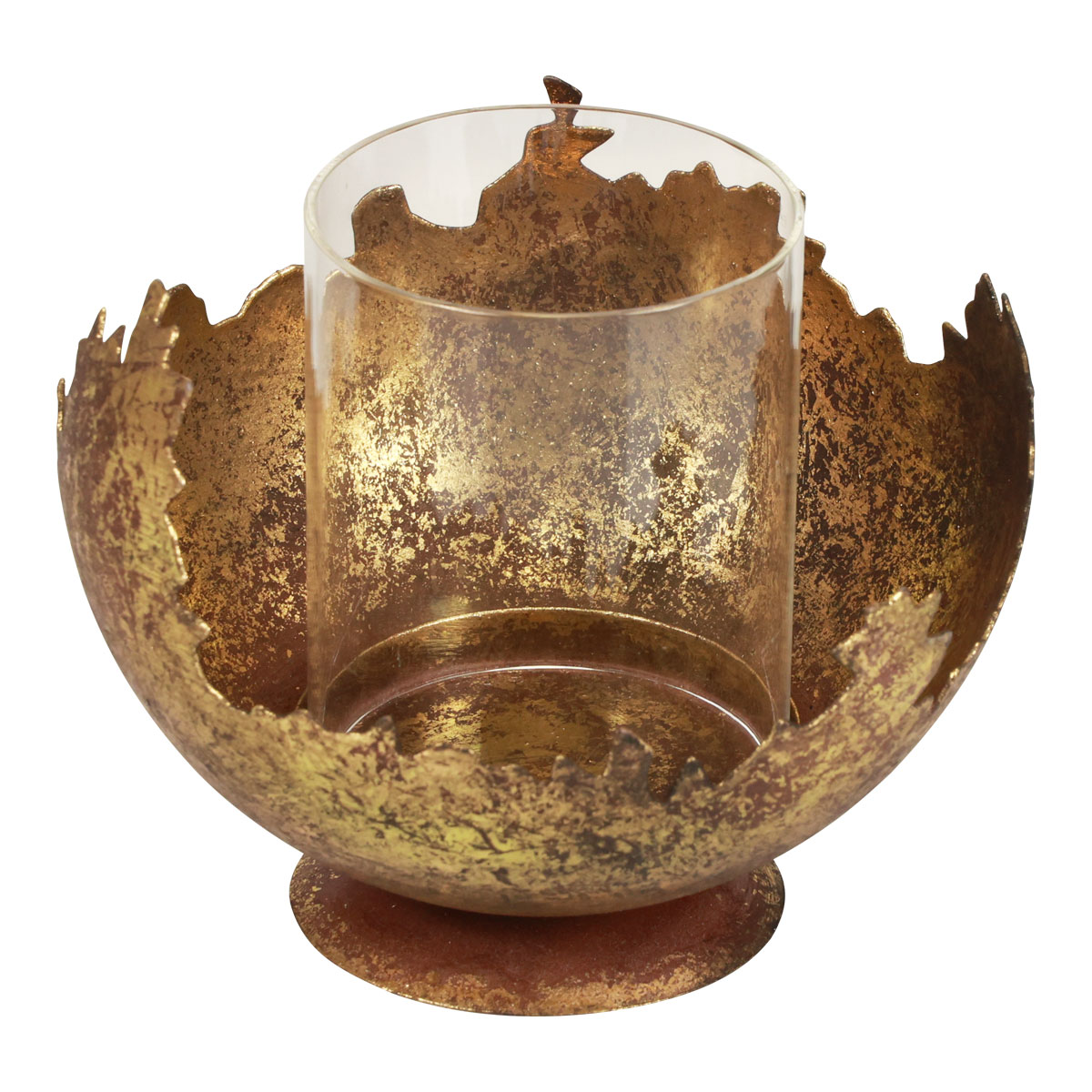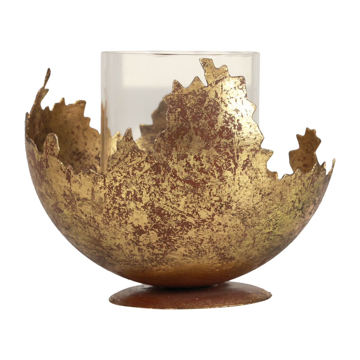 This metal light bowl comes as a lantern with a removable glass cylinder. The black and reddish-brown half-shell with an attractive eggshell-like break on the edges at different heights and a gold leaf-like patina is particularly beautiful as a table decoration for Christmas!The metal table decoration has a round base with which the candle holder stands stably and securely in the table decoration. Inside the glass cylinder there is space for tea lights and pillar candles up to a diameter of around 7 centimeters and a height of around 10 centimeters.