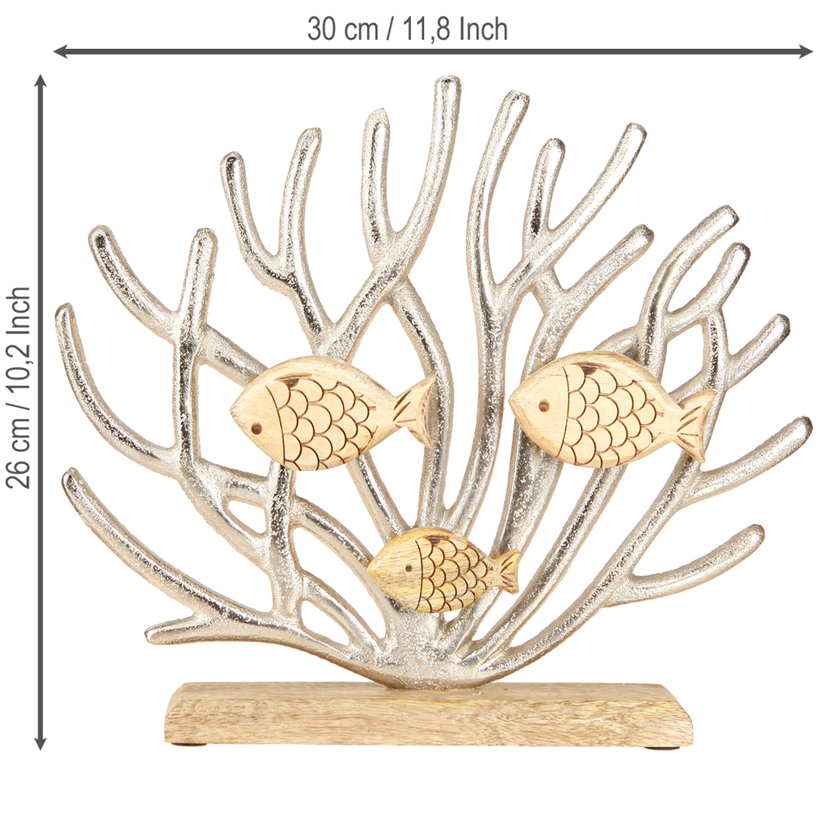 Our maritime table decoration is the perfect eye-catcher for all lovers of maritime style. This elegant decoration made of coral and fish combines the natural beauty of wood with the sophisticated look of metal. The attention to detail is reflected in the artfully designed wooden fish, which are attached to a stylized metal coral. The fish seem to be swimming past the silver-colored coral, which gives the decoration a lively and at the same time calming look. Thanks to its rustic materials, the coral decoration brings an atmospheric, maritime ambience to any home. With a length of around 30 cm, the stand is ideal for beautifying tables and highlighting summer themes. Let this rustic elegance move into your home and experience how it enhances your living room.