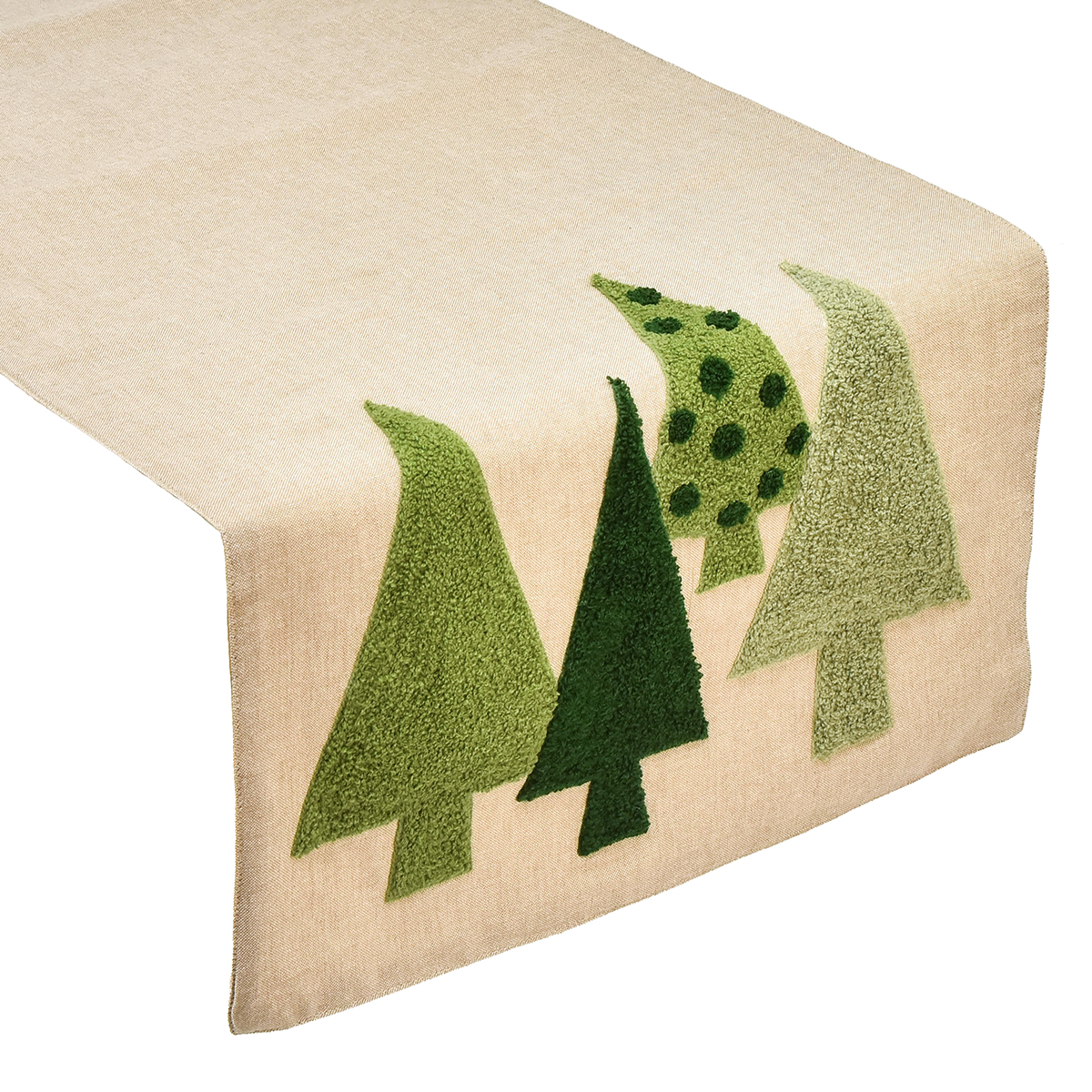 Festive, functional and fluffy - the beige-green table runner is a must-have for your Christmas decoration. Designed with four fir trees in three different shades of green, its rough-looking linen-look surface and silky-smooth polyester underside combine maximum comfort and aesthetics.