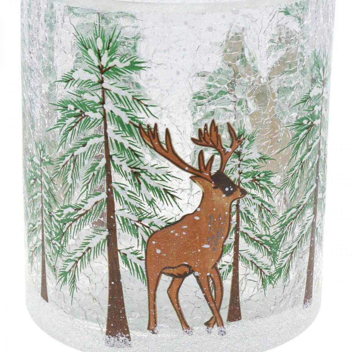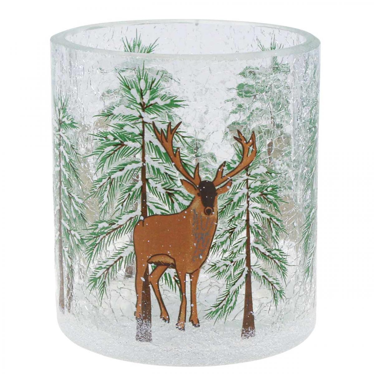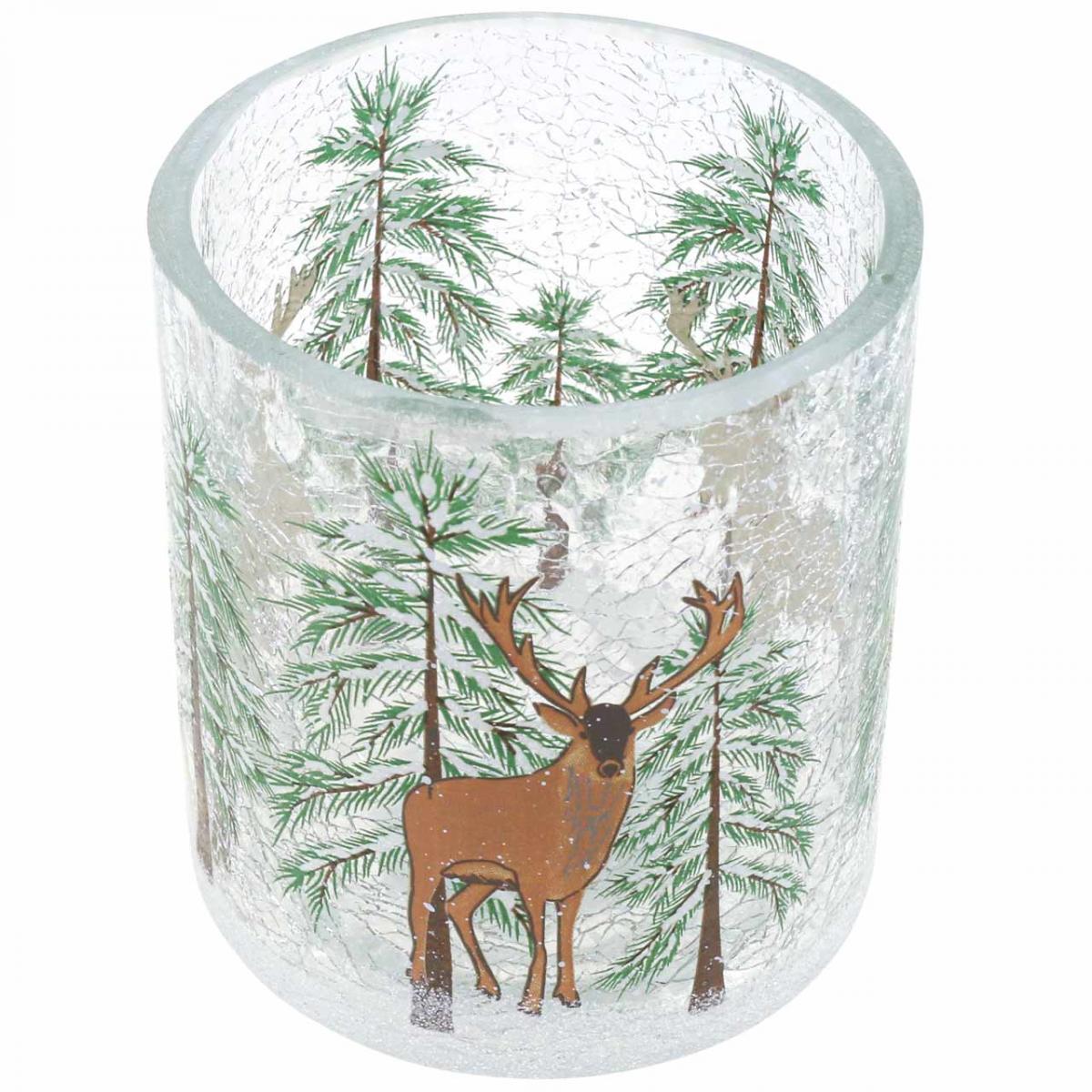 "Crackle" refers to the effect that the glass looks cracked. Nevertheless, the candle glass is brand new and decorated with an atmospheric winter forest. Three deer walk through the snow on the tea light holder, which is applied as icy glitter to the outside of the glass.