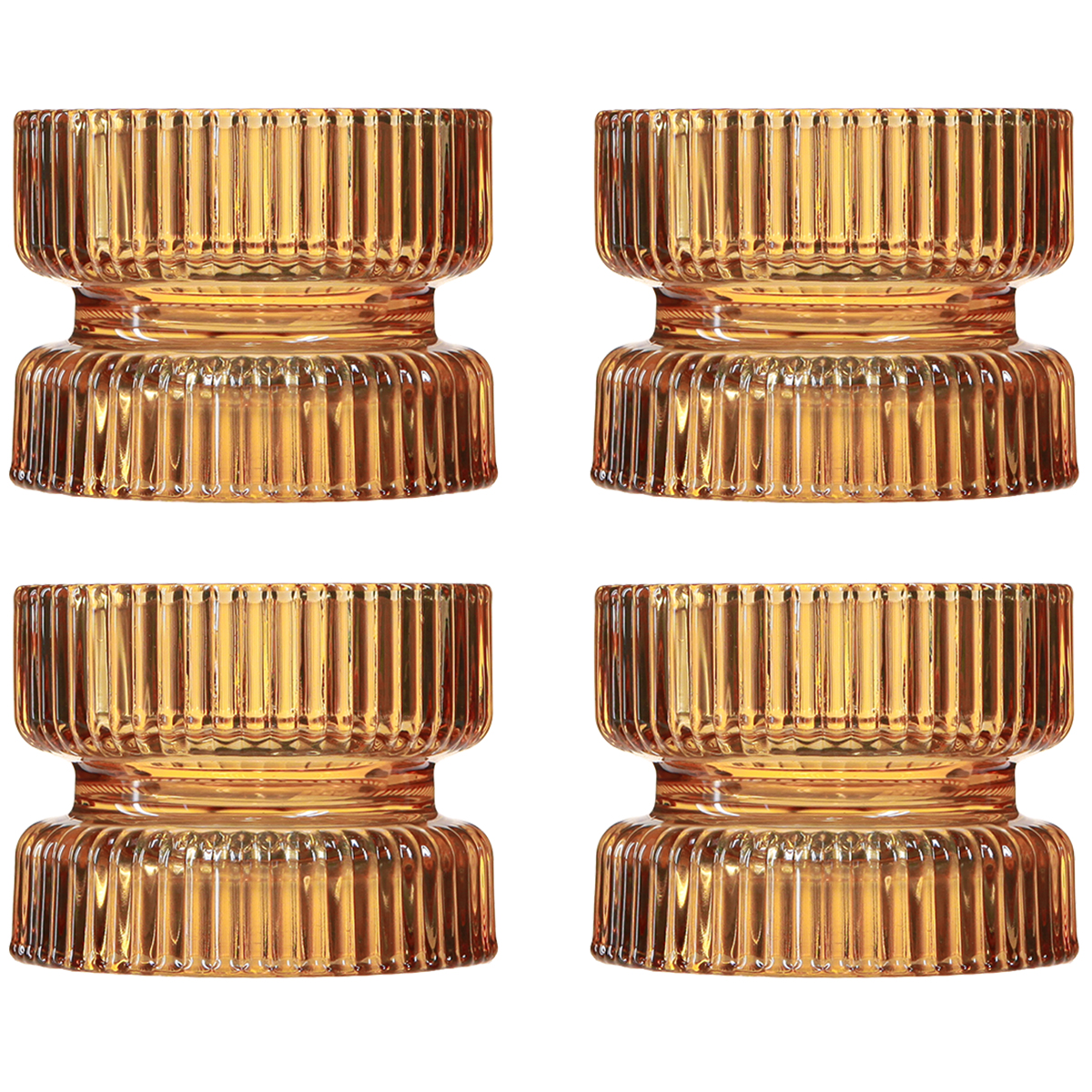 Delivered in a set of four, these high-quality glass tealight holders offer versatile options for interior design. They are particularly suitable for modern and retro styles, and their warm color and transparent material can be ideally combined with wood, metal or textiles.