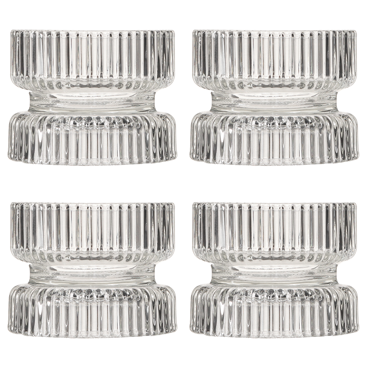 Discover the versatile charm of our fluted clear glass tealight holders and add a touch of elegance and sophistication to your living spaces and events. Combining functionality with stylish aesthetics, this set of four glass tealight holders offers the perfect solution for atmospheric lighting both indoors and outdoors.