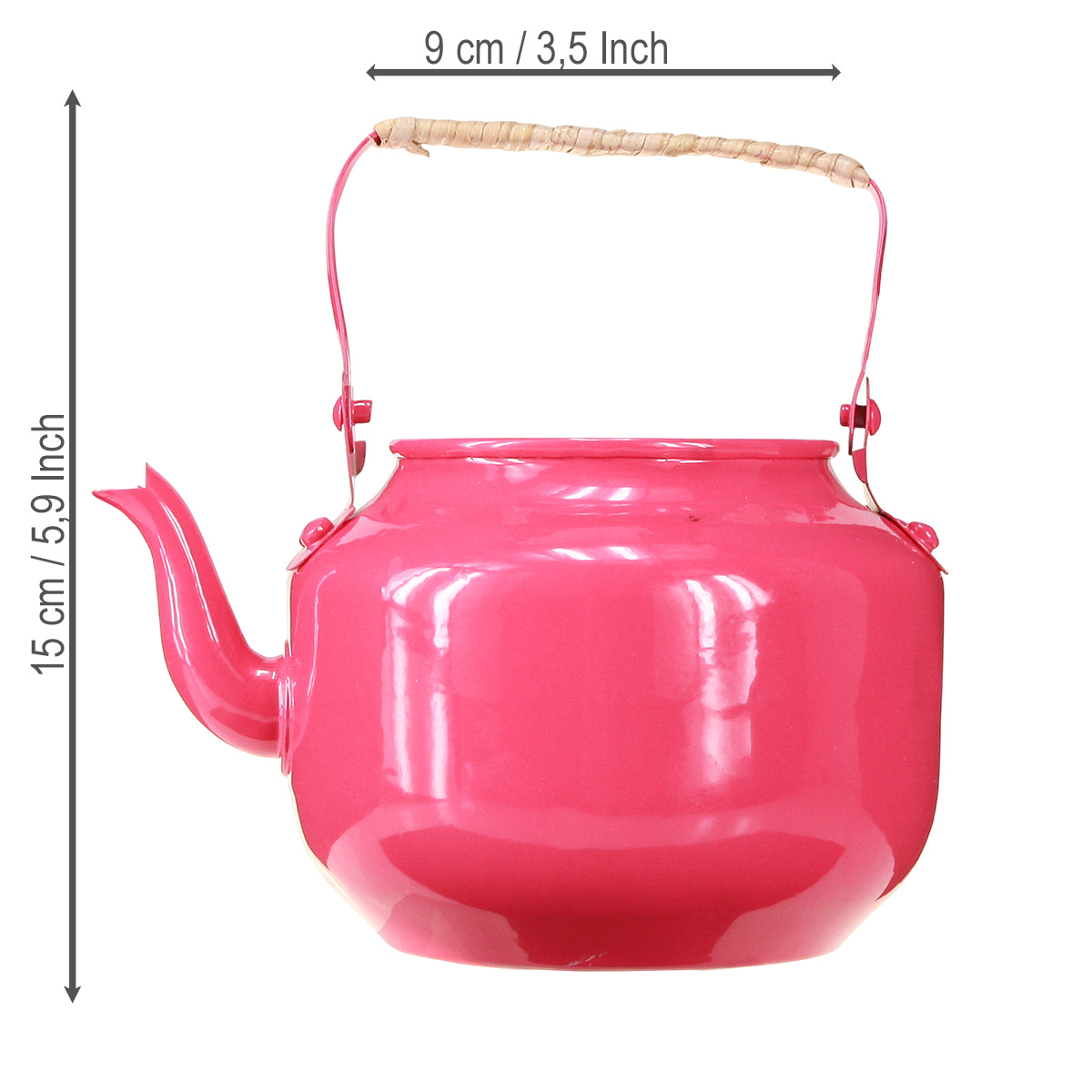 Why this teapot in particular? Its handy size, measuring 15 cm in height and 11 cm in diameter, makes it a versatile object that serves both a decorative and practical purpose. The pink color is fresh and cheerful, yet classic enough not to be overpowering. The robust metal material guarantees durability and stability, while the rustic handle with bamboo details perfectly complements the country-house feel.