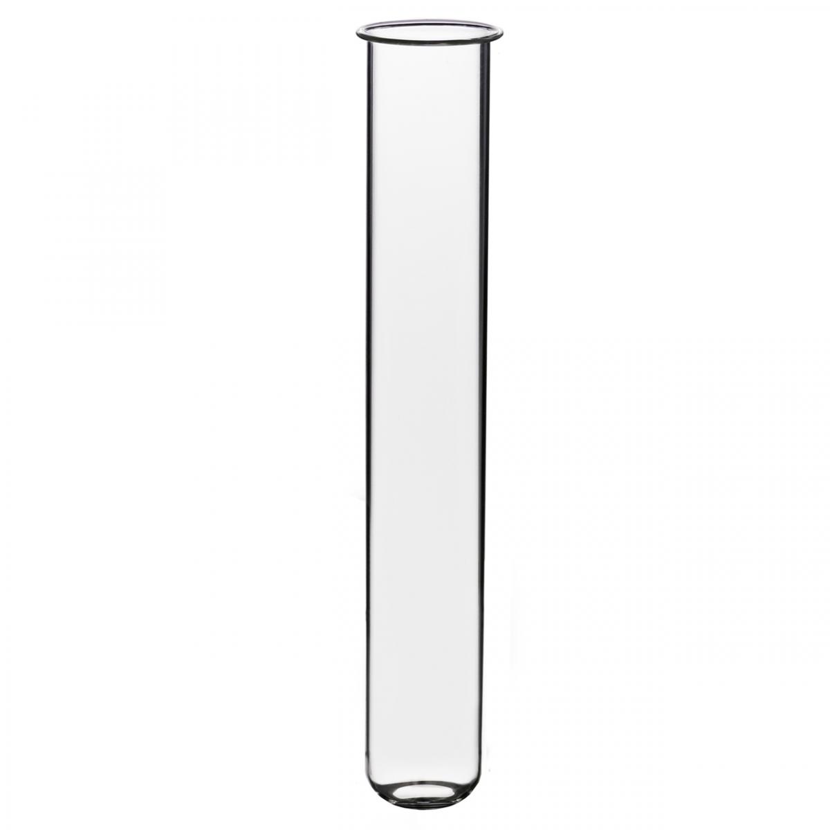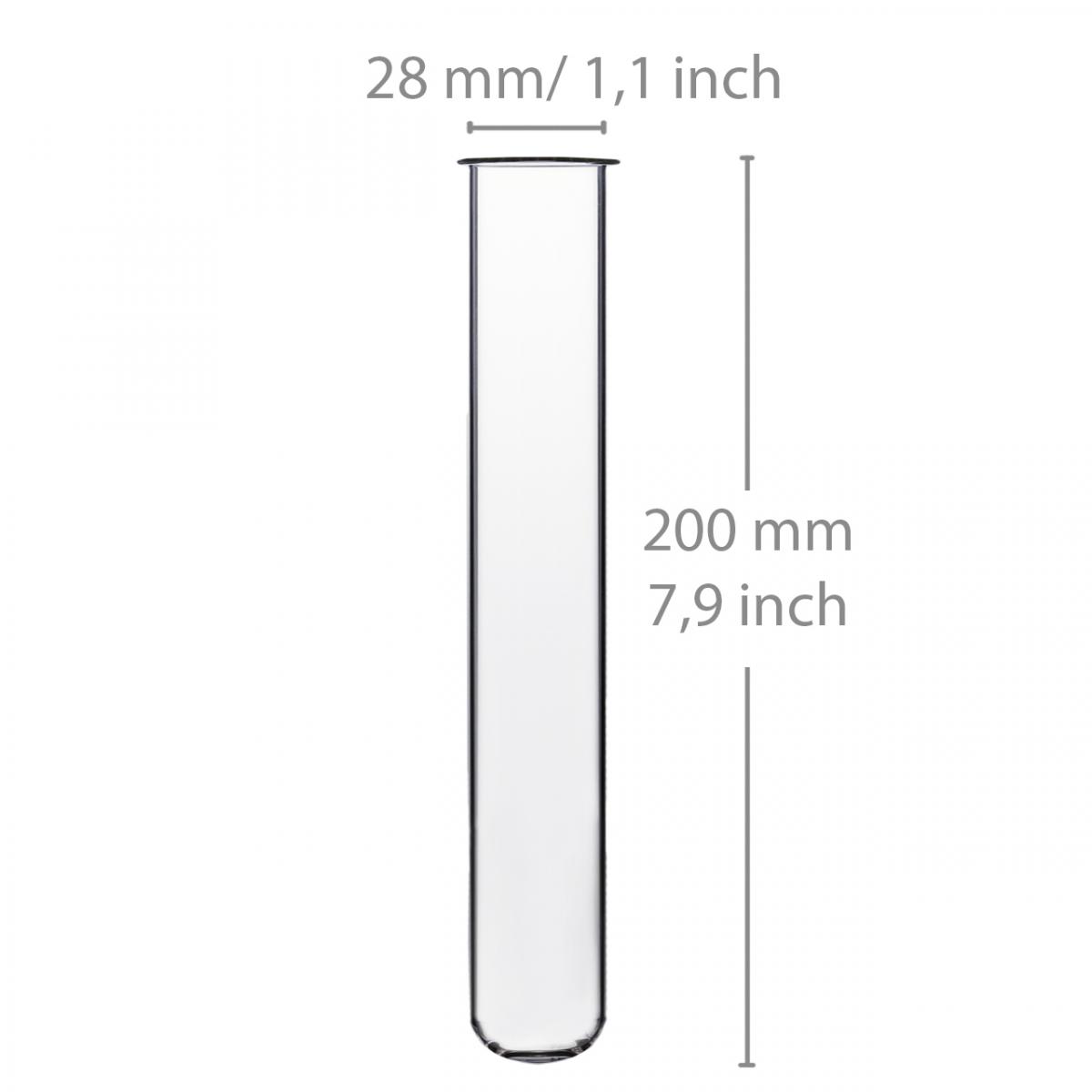 The test tube has a beaded edge, resulting in an outer diameter of approximately 34 millimeters, while the inner diameter is approximately 28 millimeters. In total, the flower tube is around 200 millimeters long.