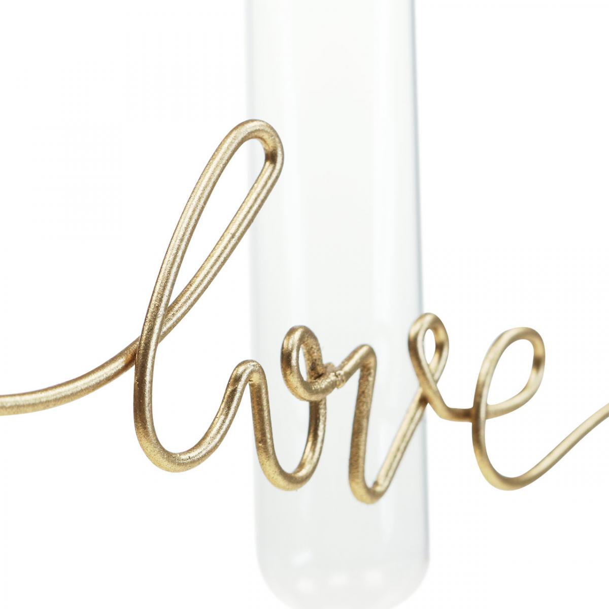 The metal test tube rack in golden has script writing on one side. There is a round holder on the top of the metal test tube stand, into which the supplied test tube vase can be easily hung.
