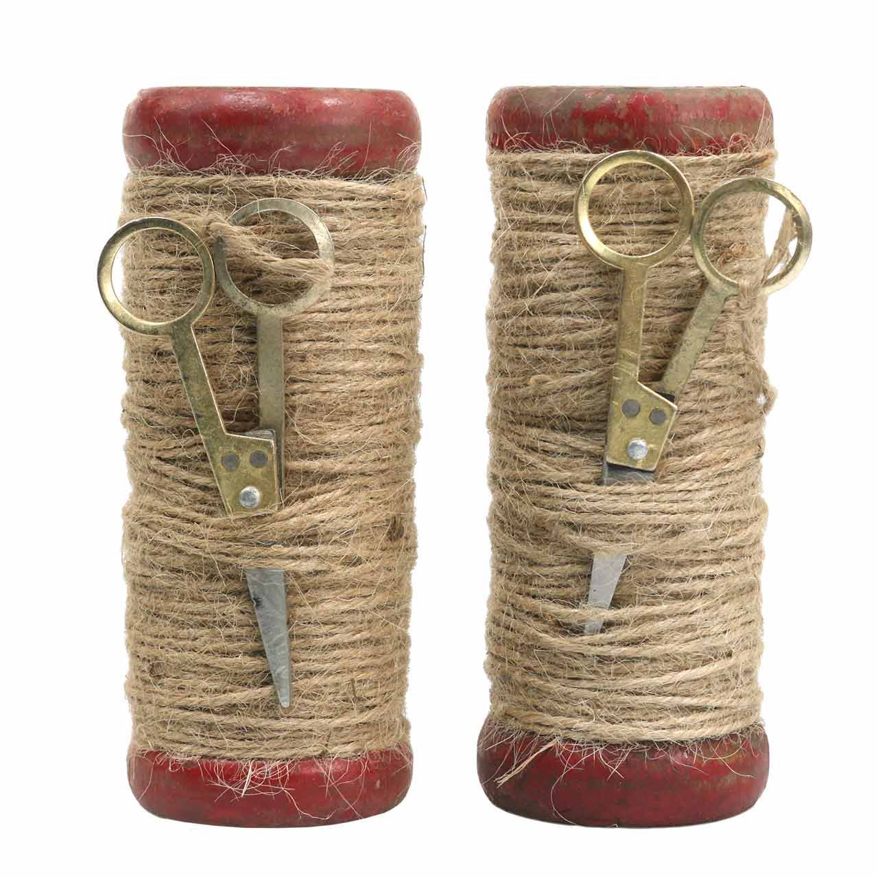 The wooden spools are painted red. The paint has been partially removed artificially on the top and bottom, which further enhances the antique character of the decorative spools. The wooden spools are wrapped in several layers of jute ribbon. Small, gold-colored metal scissors have been tied to the outside. The gold scissors are only for decoration, so they cannot really be used for cutting.
