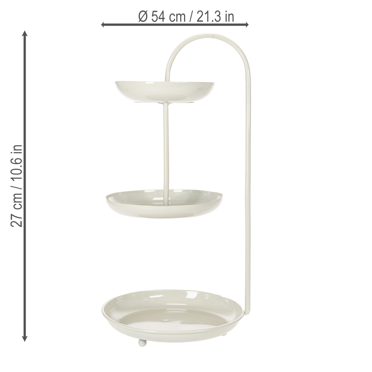 With its clean, modern look, this three-tiered serving stand fits into any room and adds a special touch to your decor. The three tiers have different diameters (26 cm, 23 cm, and 18 cm) and offer space for packaged food items or decorative elements. The neutral color scheme makes it easy to combine with other decorating styles – whether minimalist, Scandinavian, or even boho. The stand is also practical: it's easy to clean, space-saving, and sturdy. Perfect for use on the living room table, as a centerpiece on a wedding table, or for themed parties! Please note: it is not suitable for unpackaged food items, so it's ideal for chocolates, cupcakes in molds, or decorative figurines. Combine the stand with other Floristik24 items, such as a stylish table lamp or matching flower vases, to perfectly complete your ambiance!