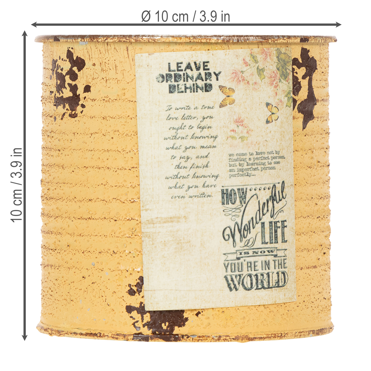 The tin can as a decorative tin in apricot is a great trend for summer plants! Classically made of metal, the plant pot still shows the light silver color of a tin can on the inside. The outside of the planter is painted in two colors in rust and orange and additionally decorated with artificial rust spots. A dreamy, nostalgic label completes the vintage decoration of the small metal flower pot. Of course, the metal flower pot has smooth edges instead of the sharp edges of its role model. So you can also easily use the tin decoration for handicrafts with children and gardeners.